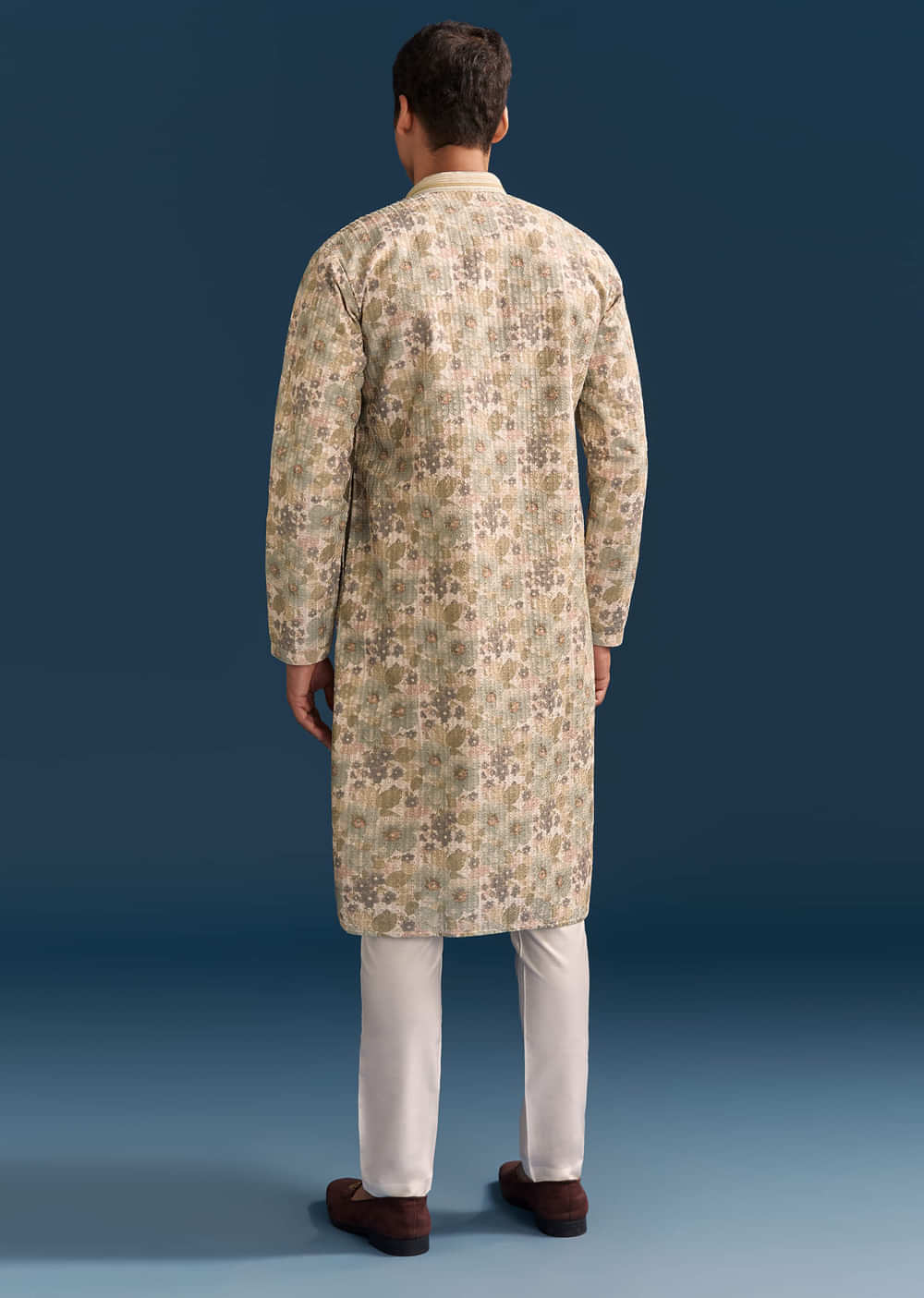 Beige Silk Floral Kurta Set For Men With Thread Embroidery