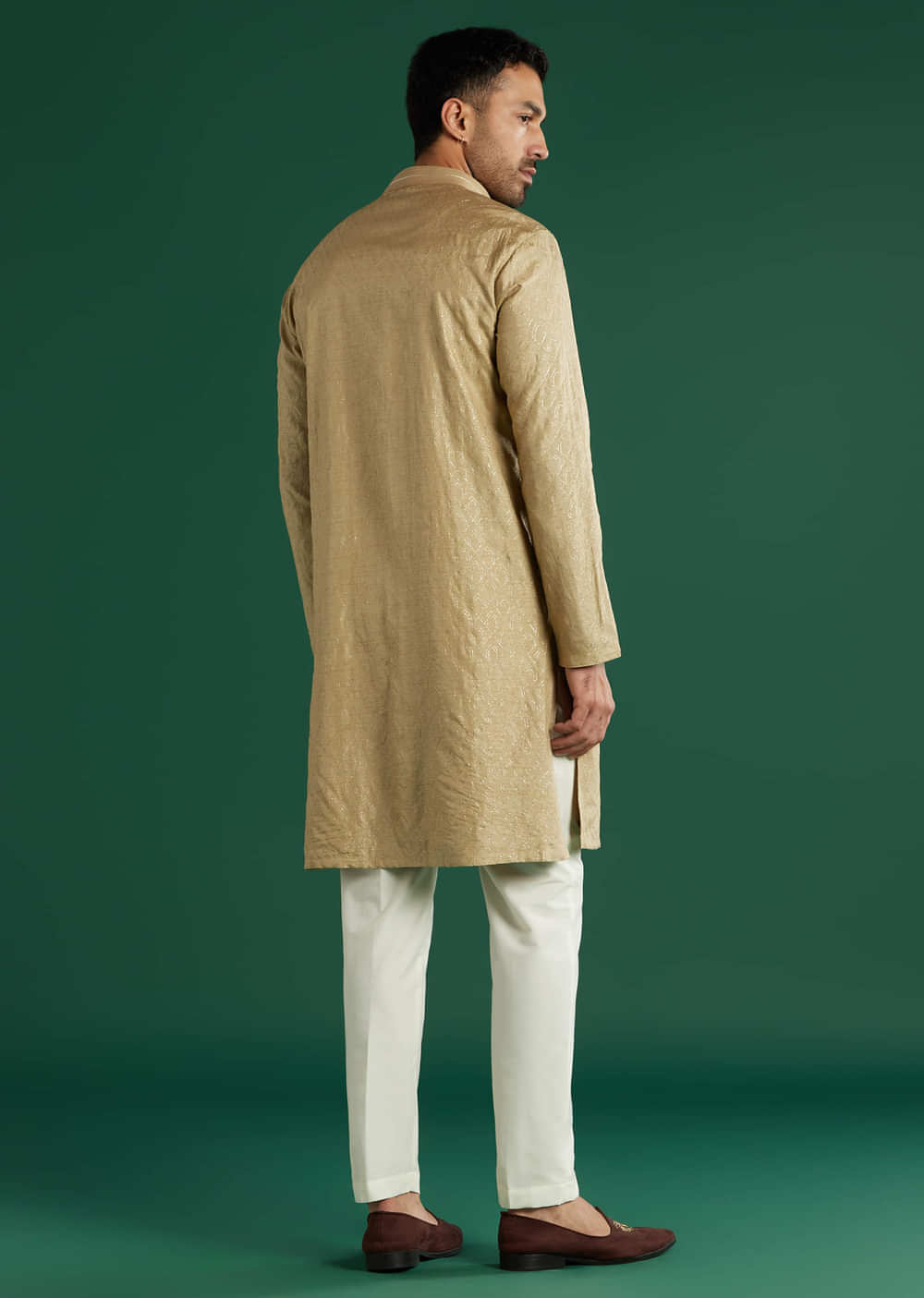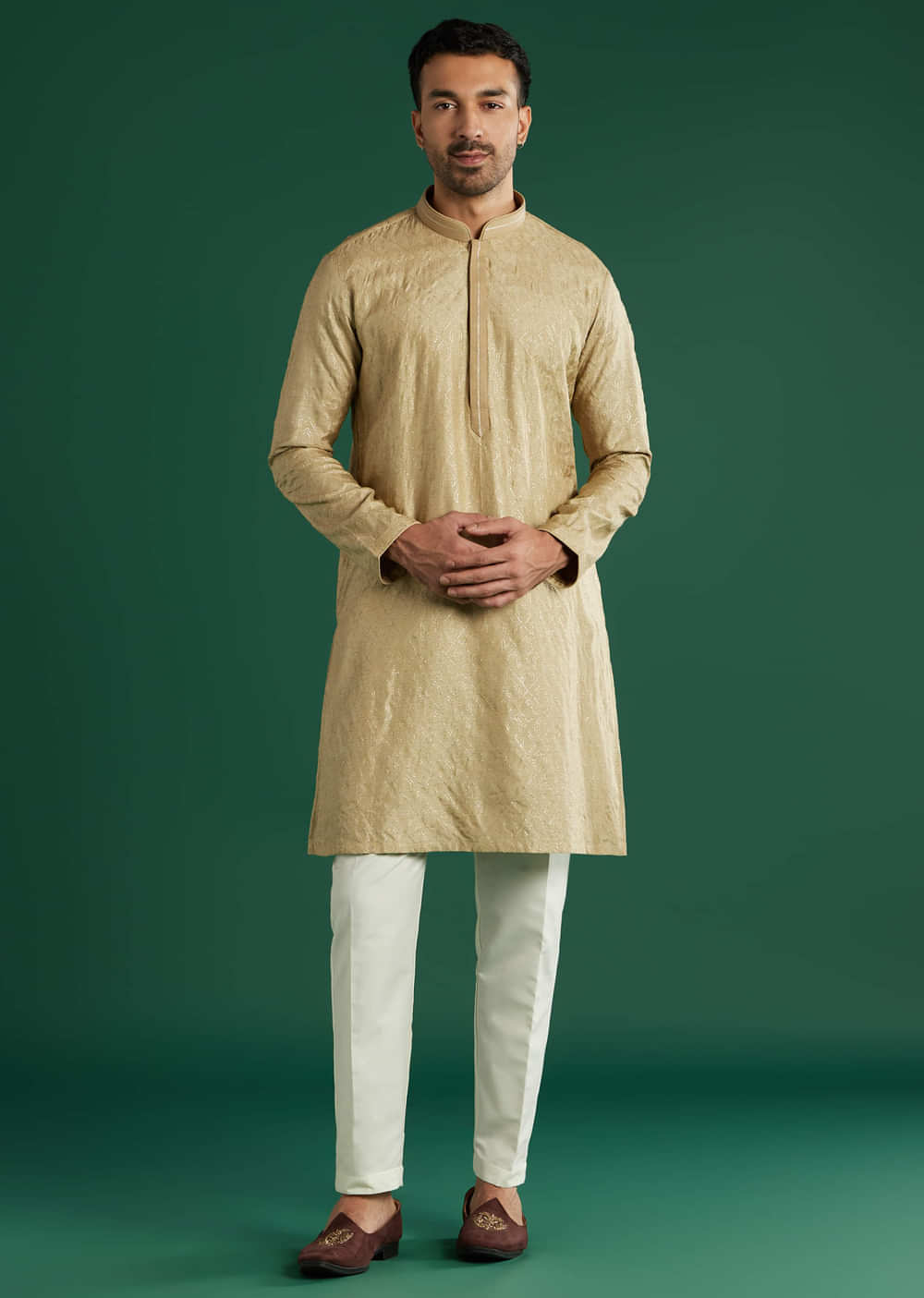 Beige Silk Kurta Set For Men With Subtle Woven Texture
