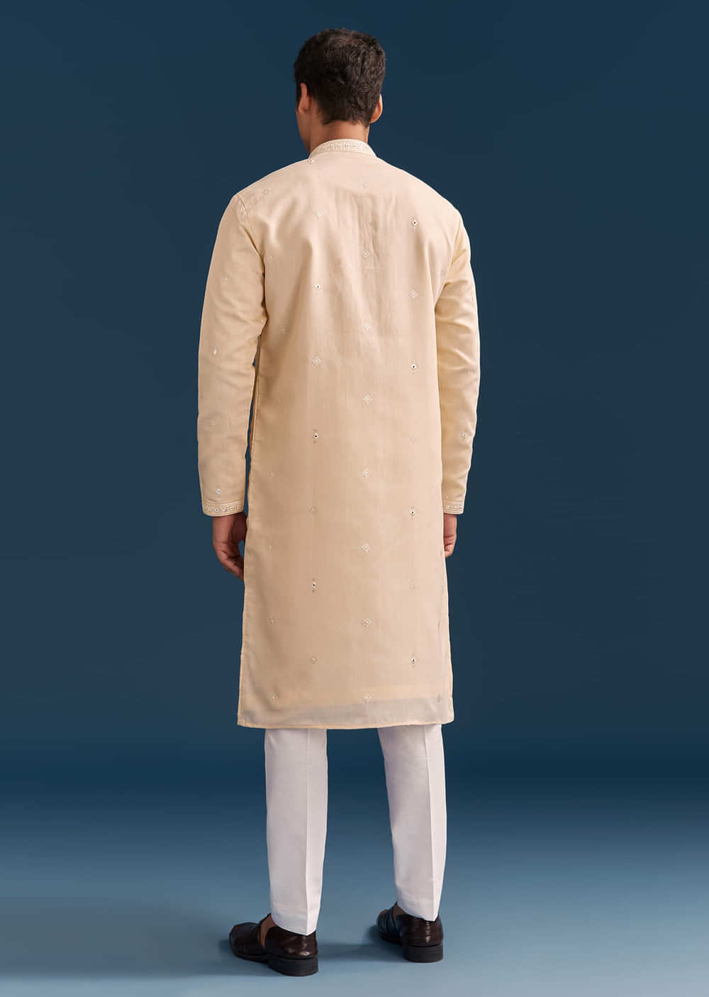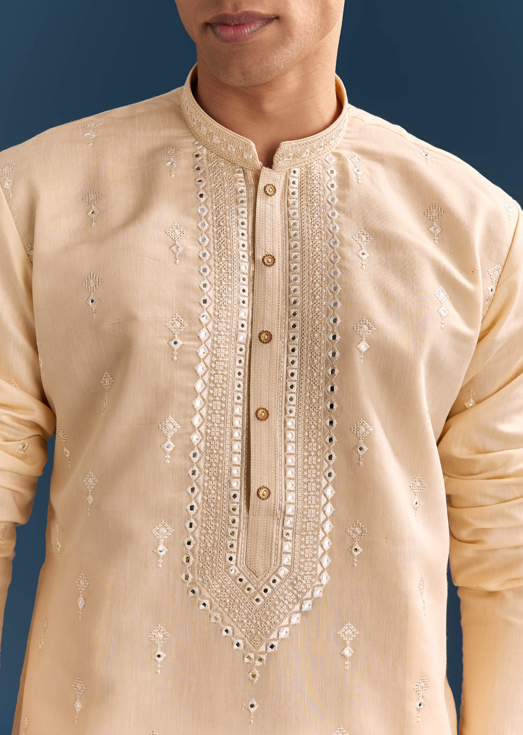 Beige Silk Kurta Set For Men With Thread And Mirror Embroidery