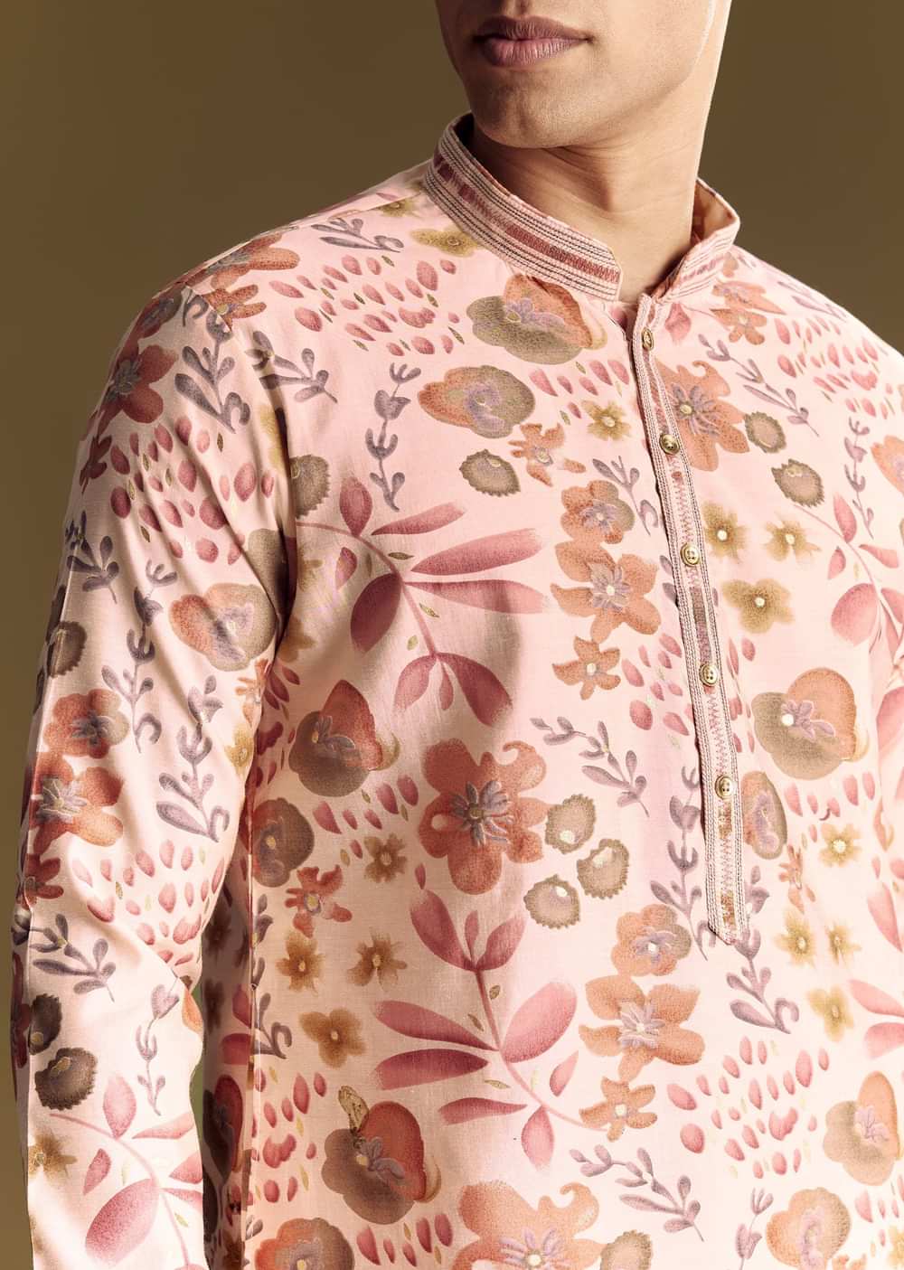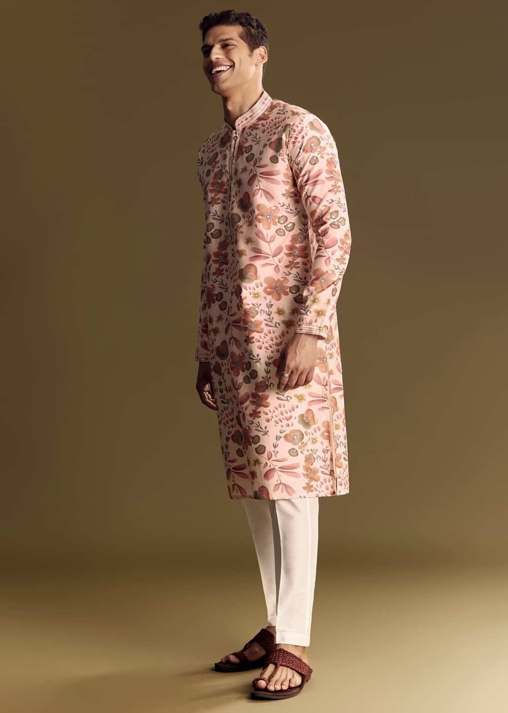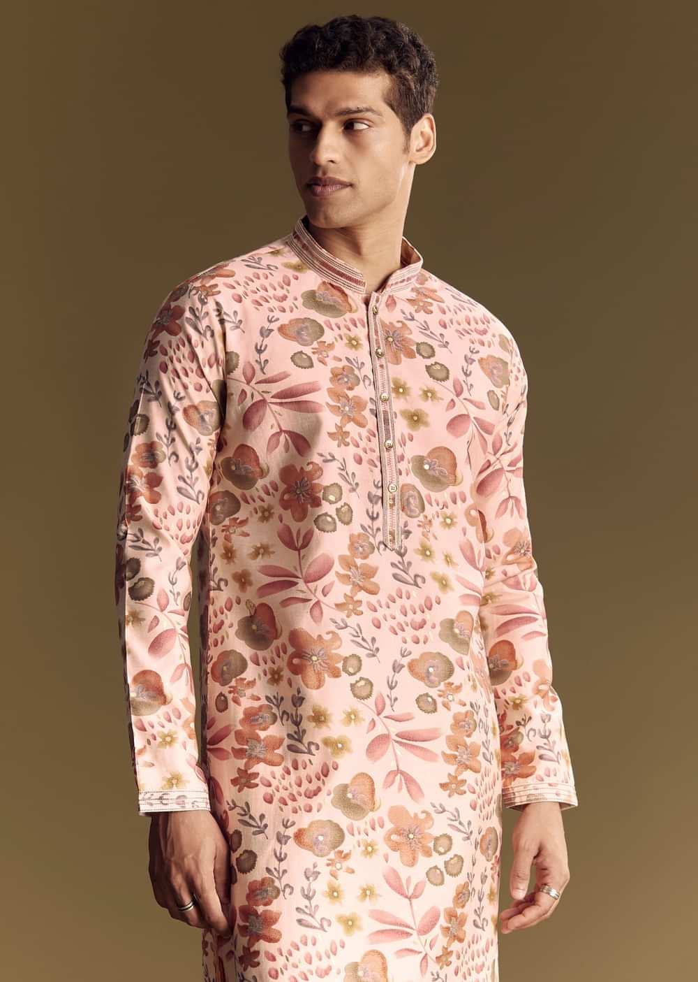 This beige silk kurta set exudes subtle elegance with its floral foil print and stone embellishments. Ideal for refined festive occasions, the mandarin collar and smooth finish add a hint of luxury to a traditional look. Awarded as the Most Trusted Brand, we're delivering styles you love, just as promised.