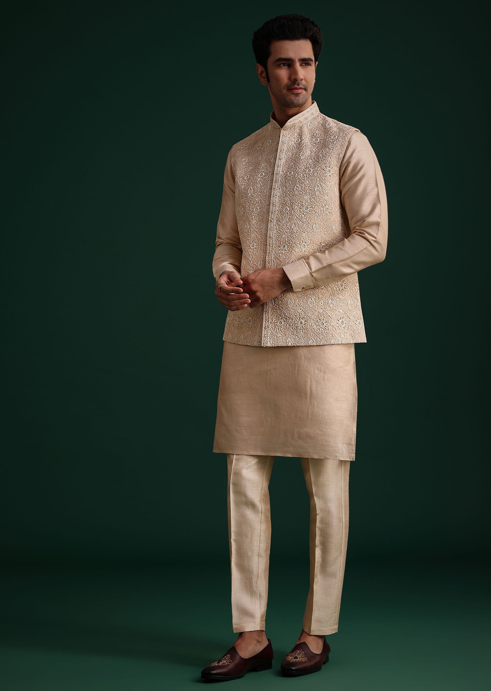 Elevate your festive wardrobe with this beige silk jacket kurta set featuring intricate threadwork that exudes understated elegance. The combination of a tailored jacket and classic kurta makes it perfect... More Product Details