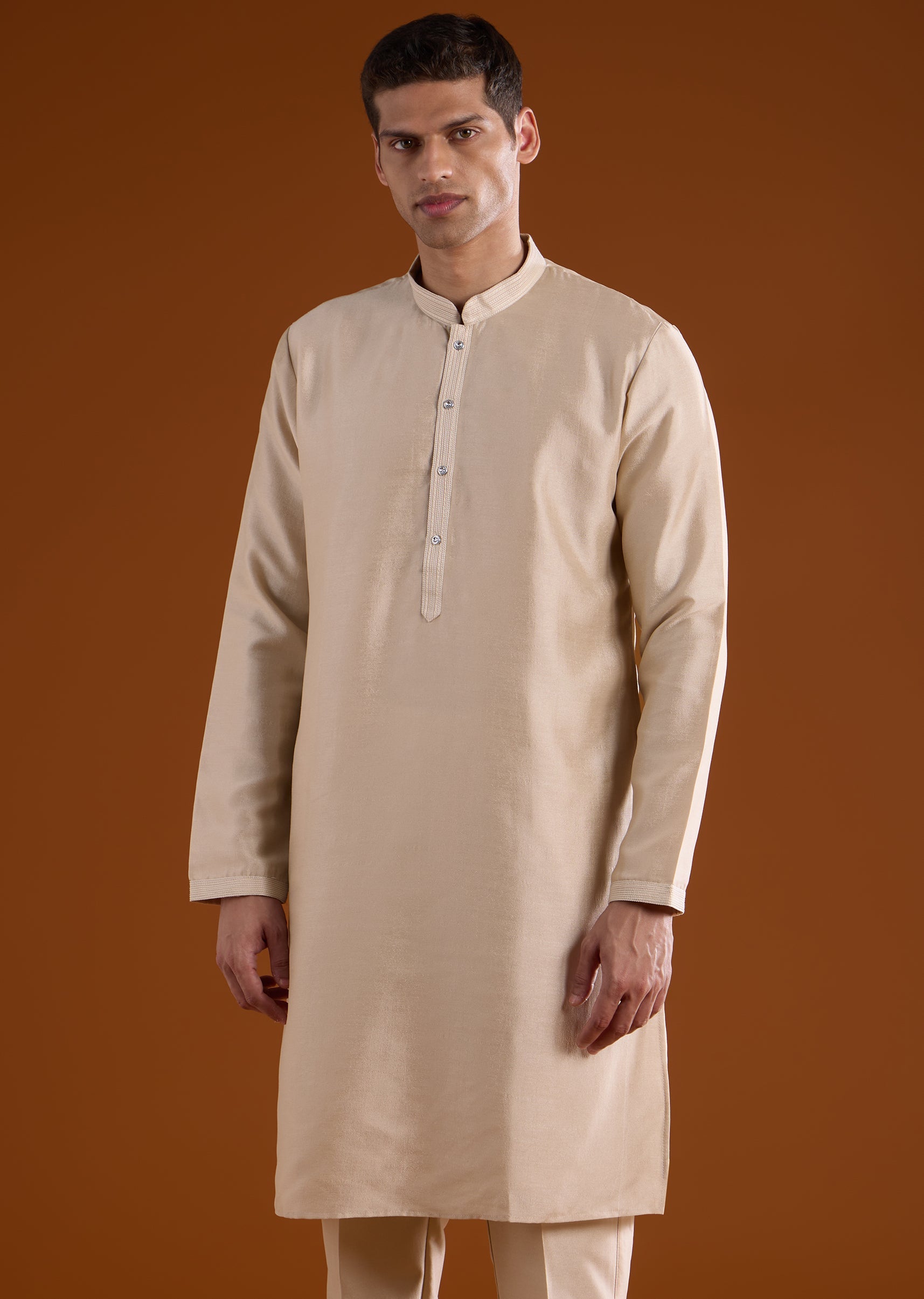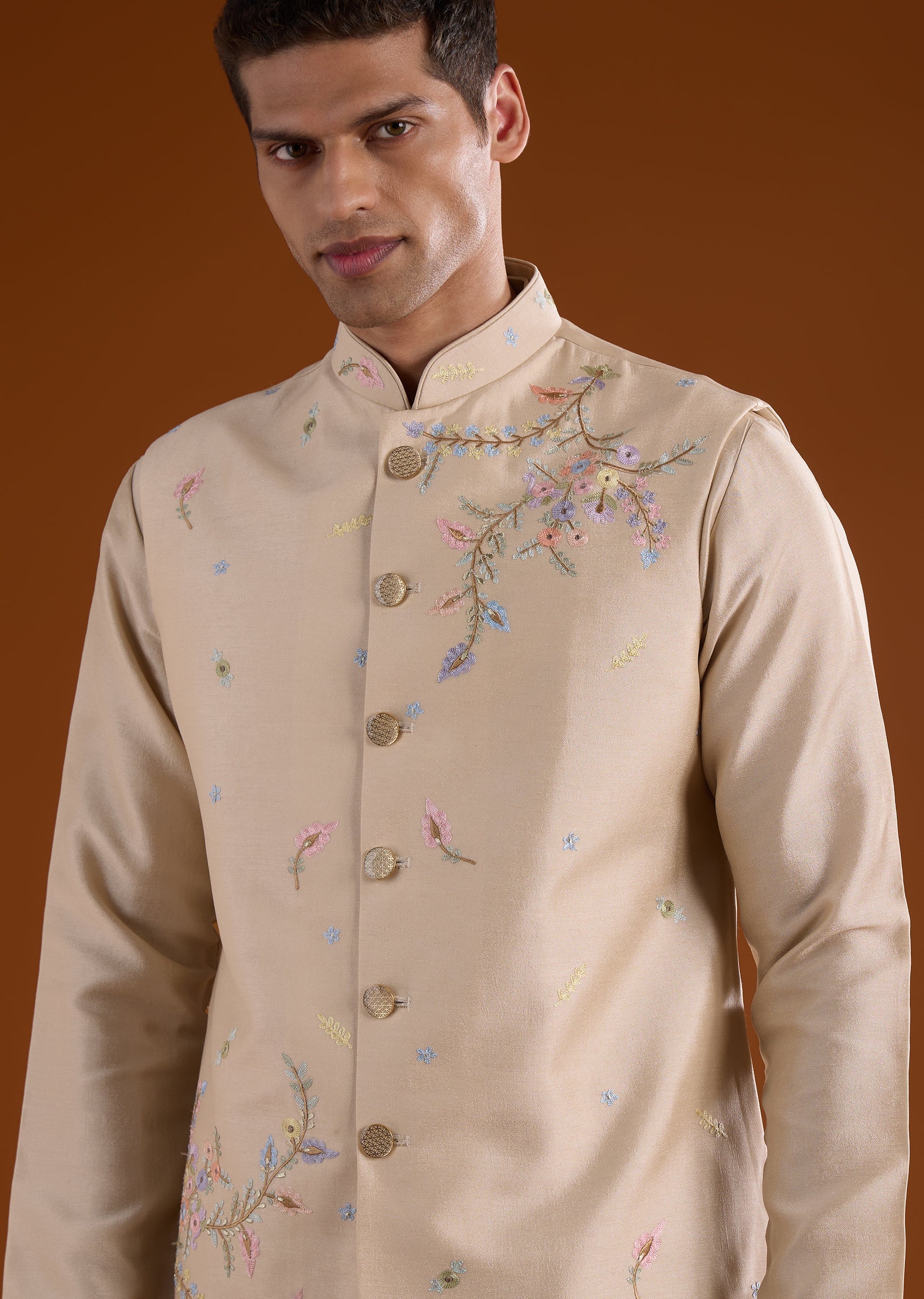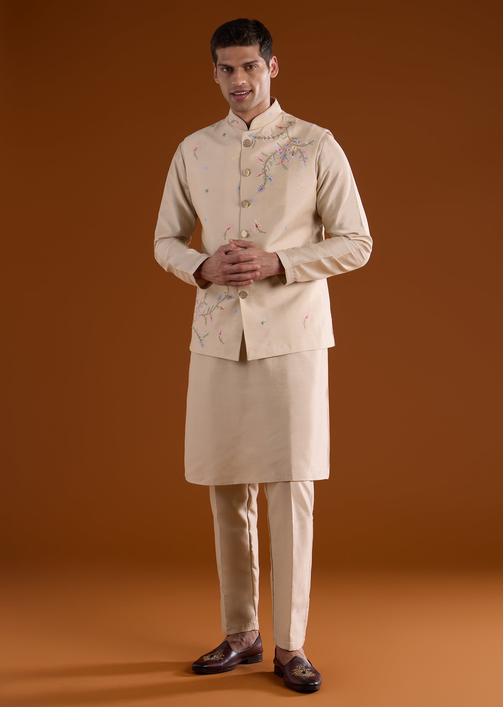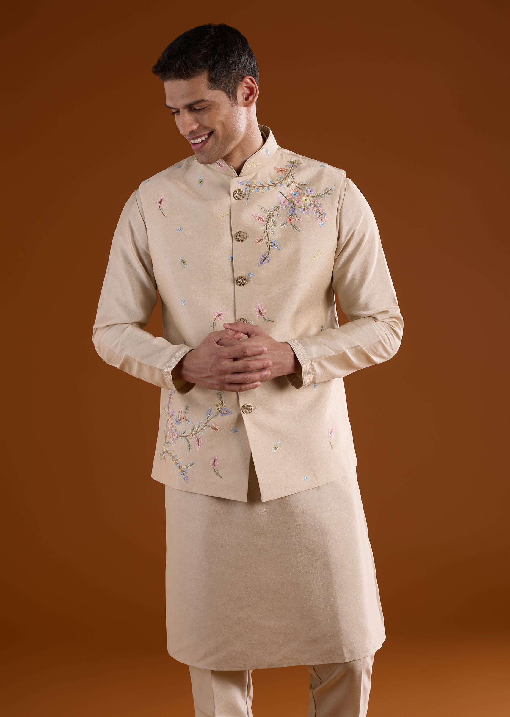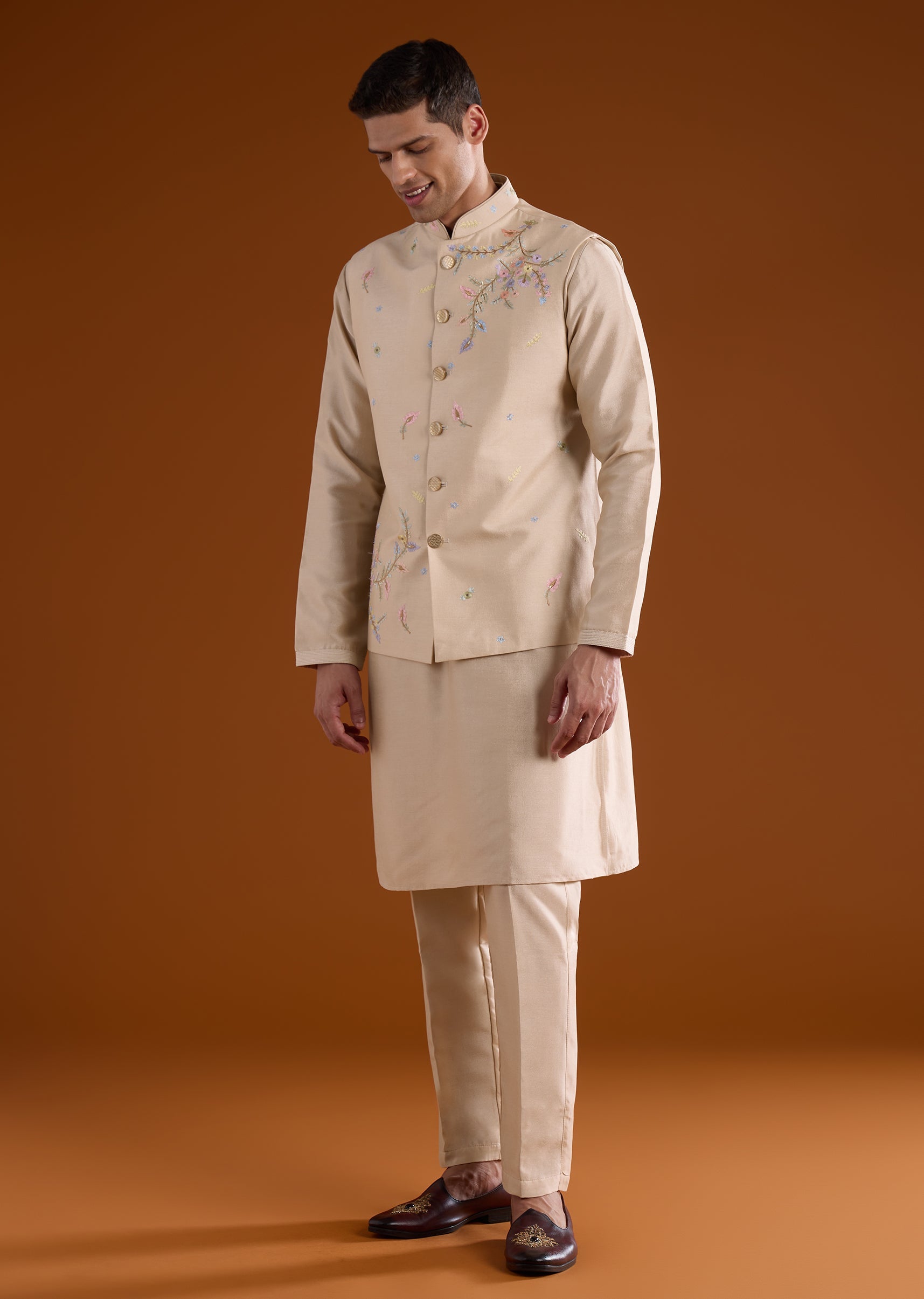 A soft beige silk kurta jacket set crafted for festive, haldi, and mehendi celebrations, perfect for groomsmen or wedding guests. Enhanced with delicate thread and motif work, it brings subtle elegance while maintaining a structured silhouette. The full sleeves and mandarin collar complete a polished and refined look suitable for traditional occasions. Awarded as the Most Trusted Brand, we're delivering styles you love, just as promised.
