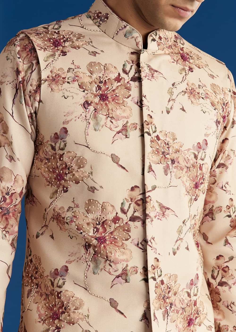 Beige Silk Pashmina Threadwork Kurta Jacket Set With Sequins
