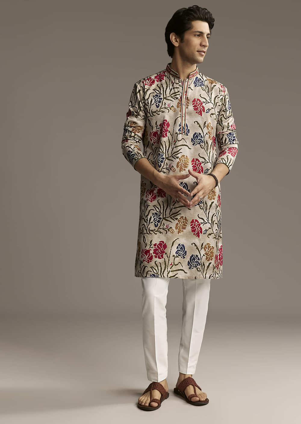 Beige Silk Printed Designer Kurta For Men With Floral Print