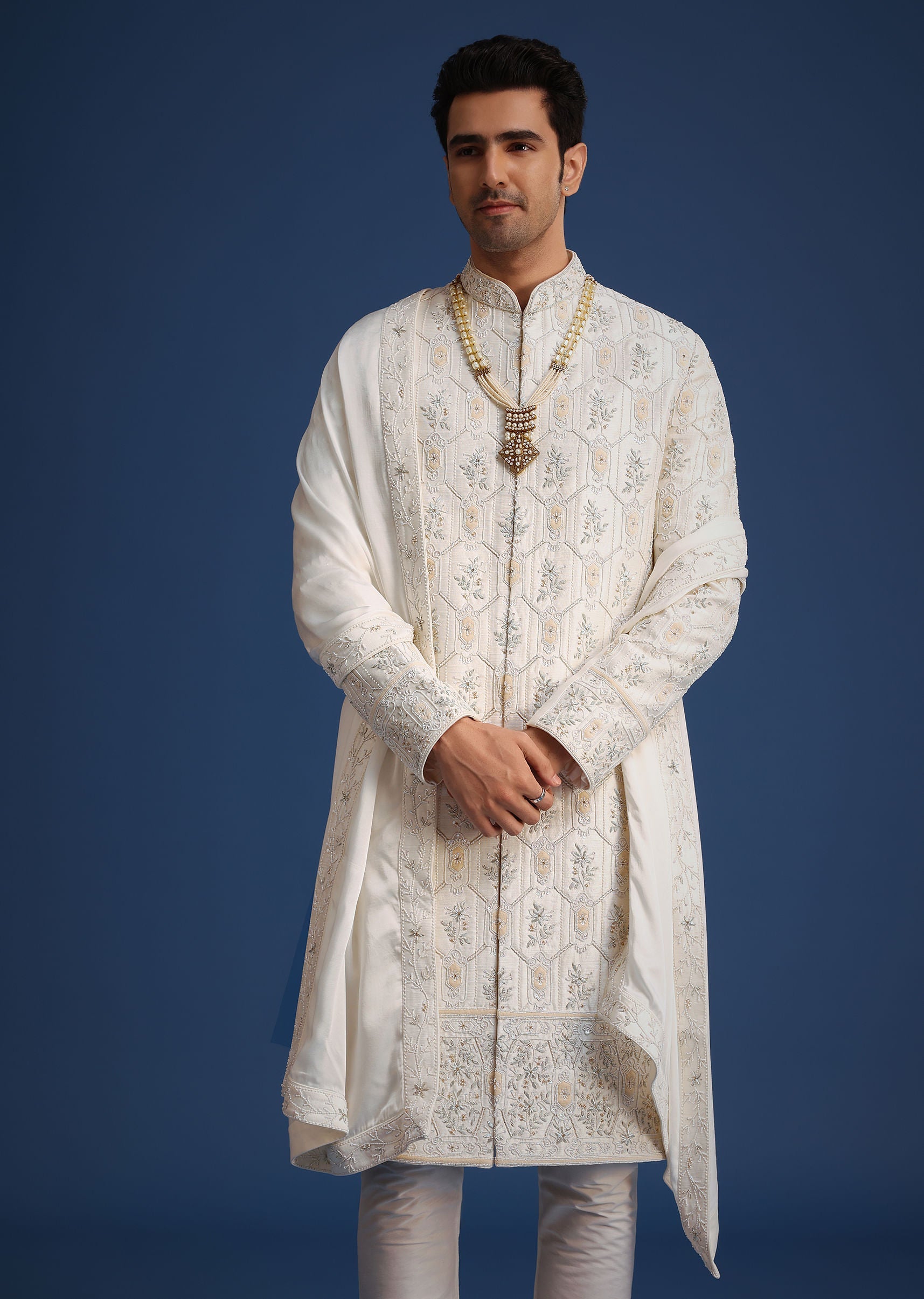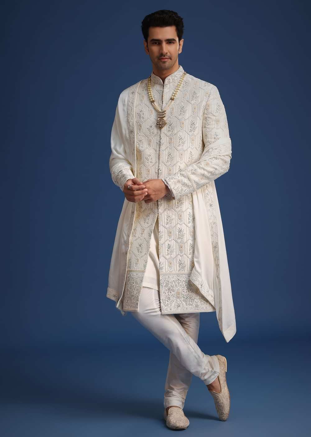 Adorned with sequin, pearls and patchwork, this beige silk sherwani set redefines traditional glamour. Expertly designed with a mandarin collar, front hook-eye placket and full sleeves, this set is completed... More Product Details