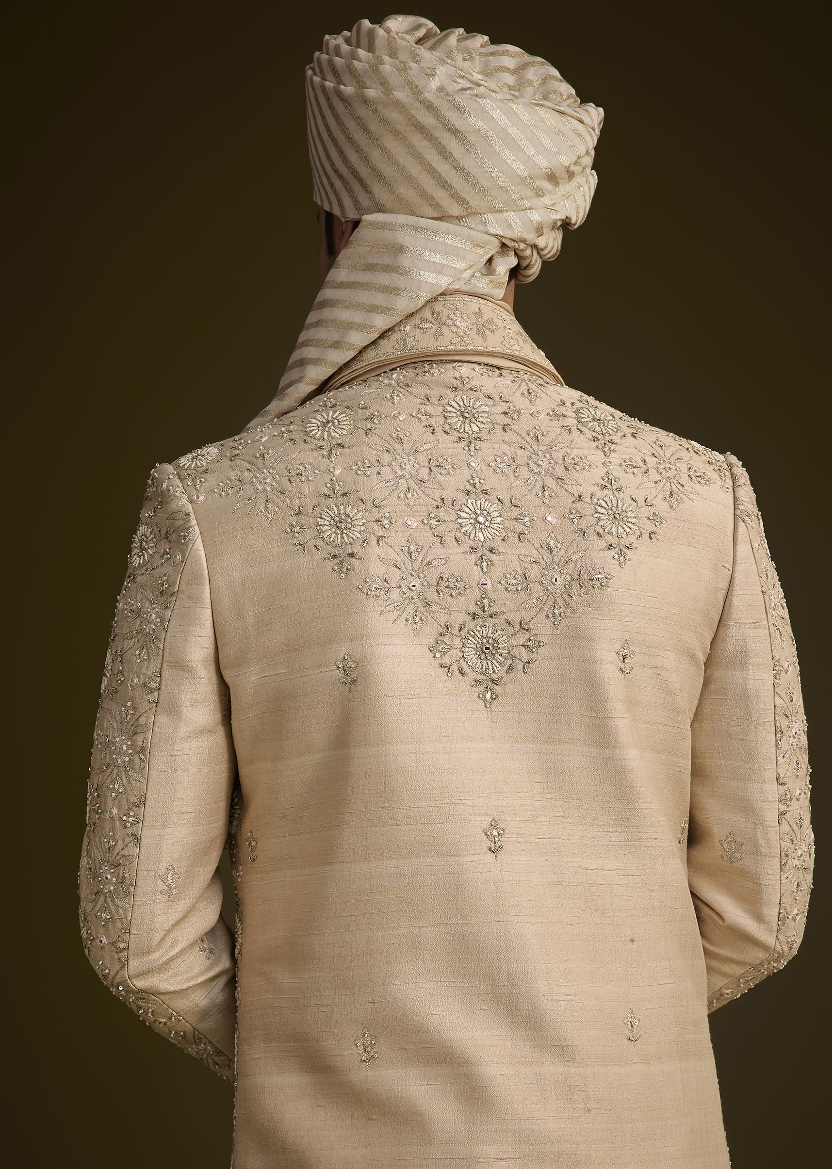 Beige Silk Sherwani Set With Zardosi Embroidery And Anarkali Kurta