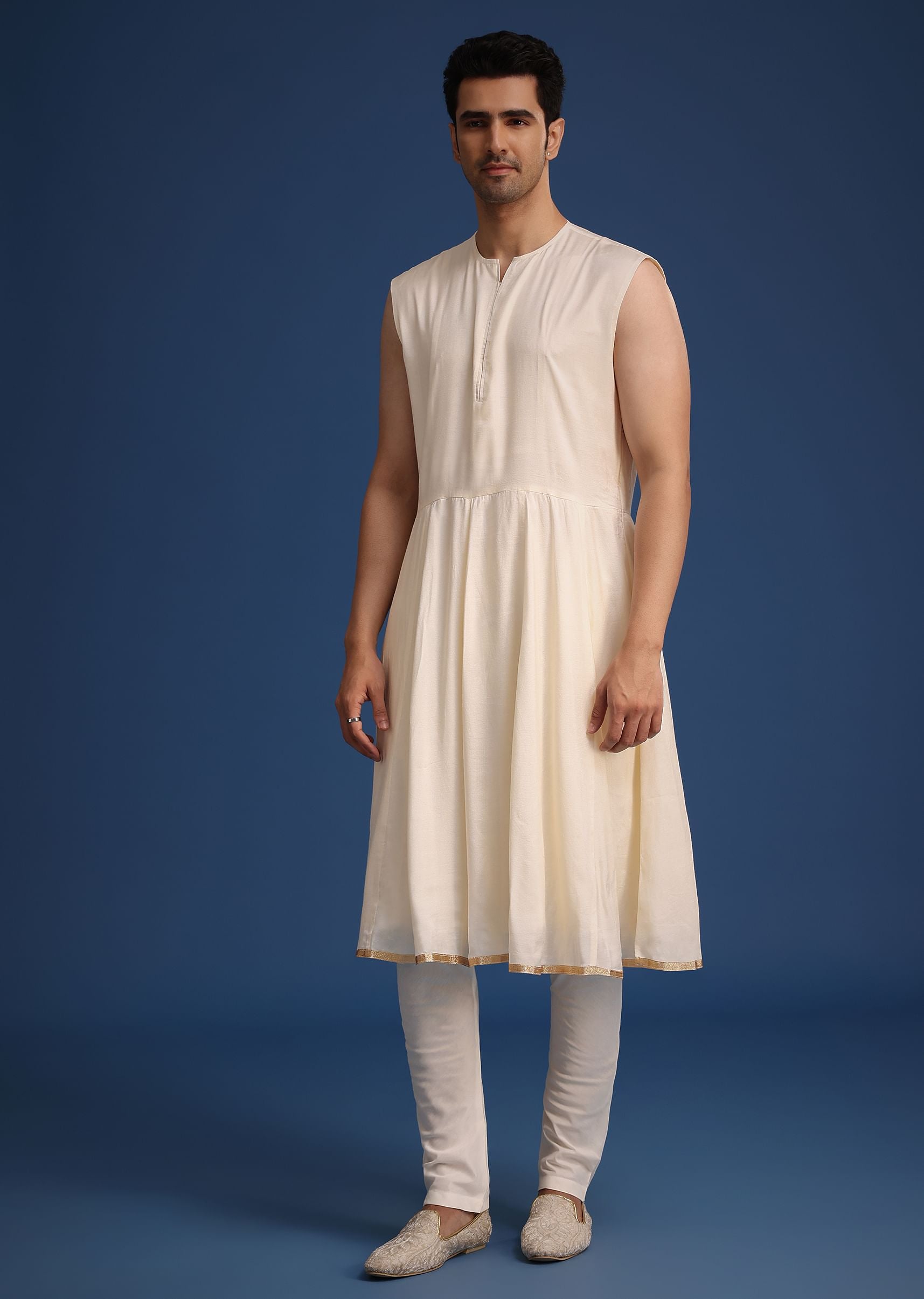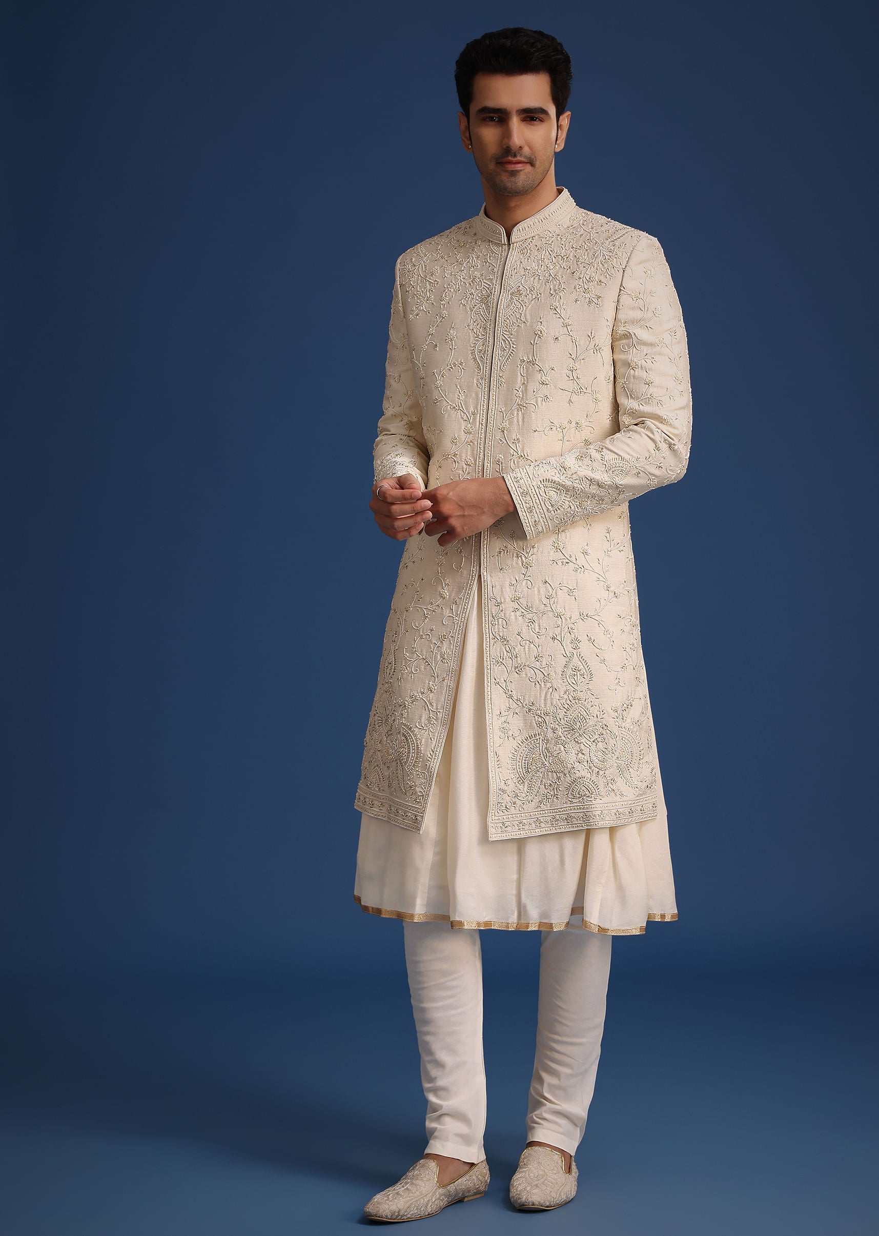 Offering a resplendent look, our beige silk sherwani set exudes old world charm and refined glamour. Designed with a mandarin collar, front hook-eye placket and full sleeves, the exquisite craftsmanship is highlighted with accents of zardozi embroidery. Paired with a complementing kurta, dupatta, and co-ordinating bottoms, consider this outfit an ideal choice to your luxurious ethnic collection. Awarded as the Most Trusted Brand, we're delivering styles you love, just as promised.