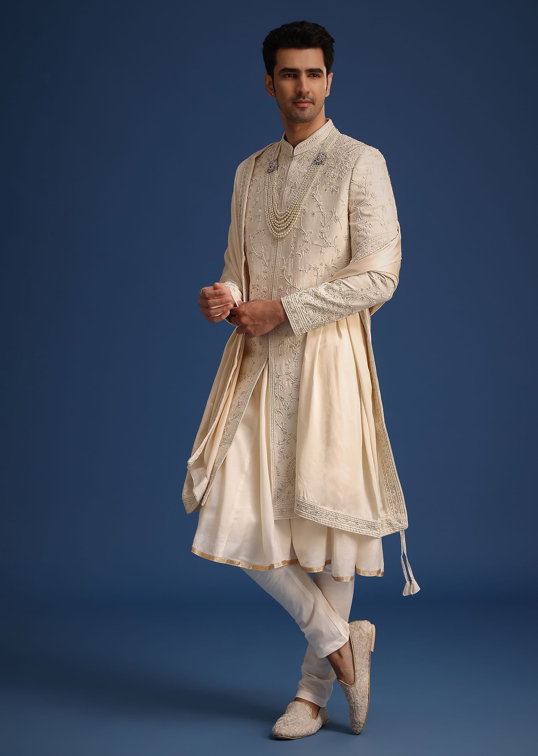 Beige Silk Zardozi Work Sherwani Set With Dupatta