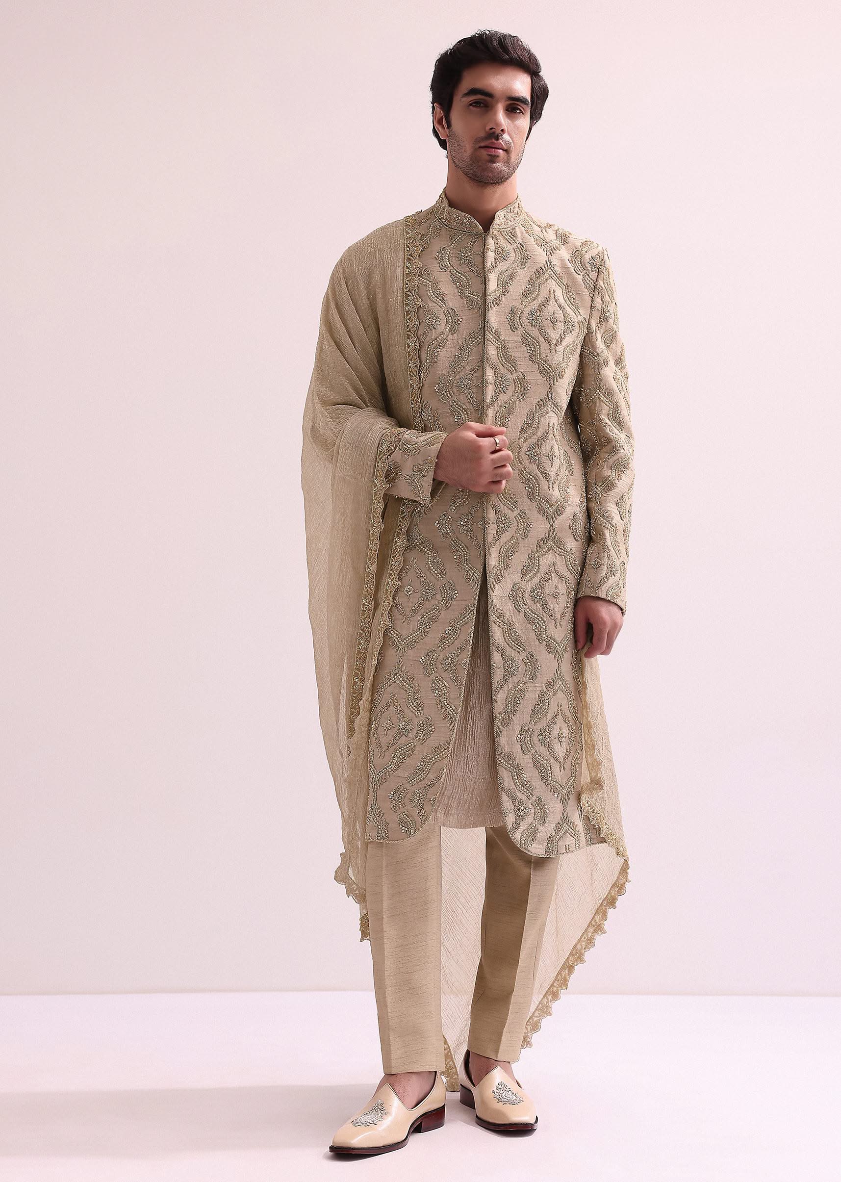 Beige Straight Cut Double Layered Sherwani And Kurta Set In Raw Silk