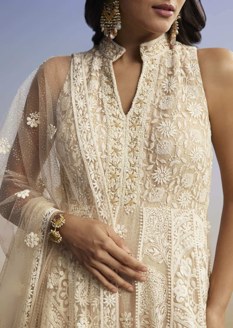 Subtle yet stunning, this beige net anarkali features fine thread embroidery and a mandarin collar neckline. Soft as moonlight and effortlessly graceful, it brings a hush of elegance to your... More Product Details