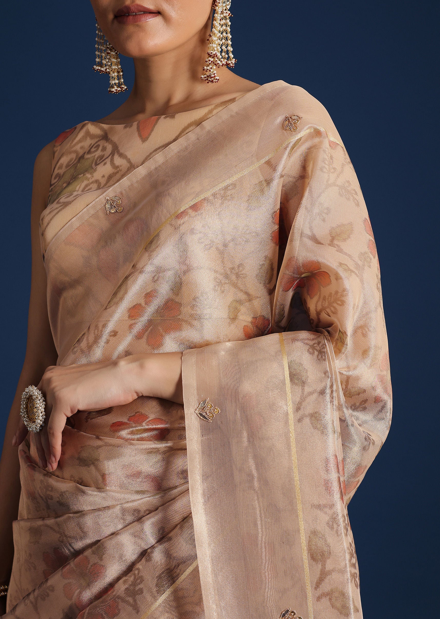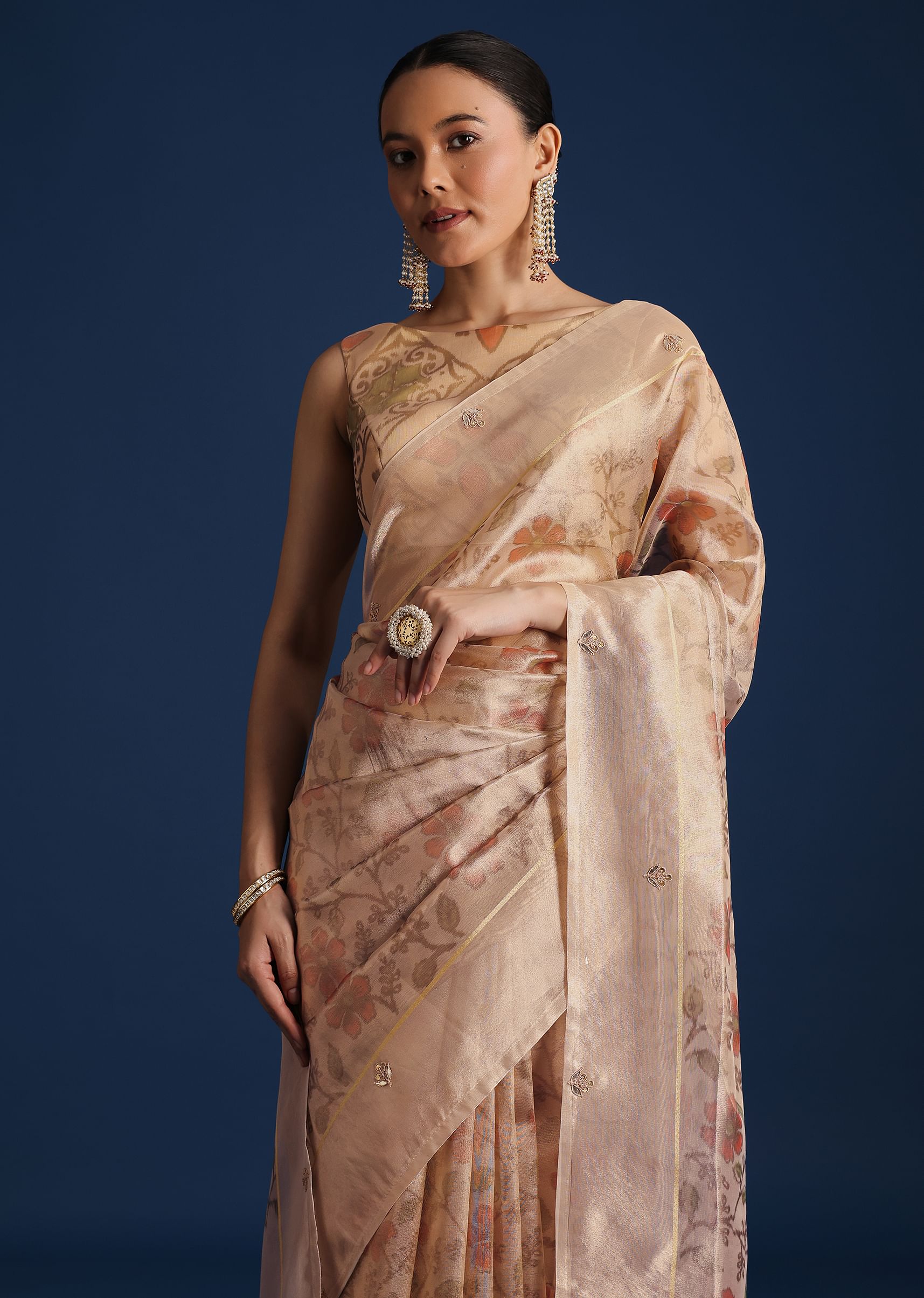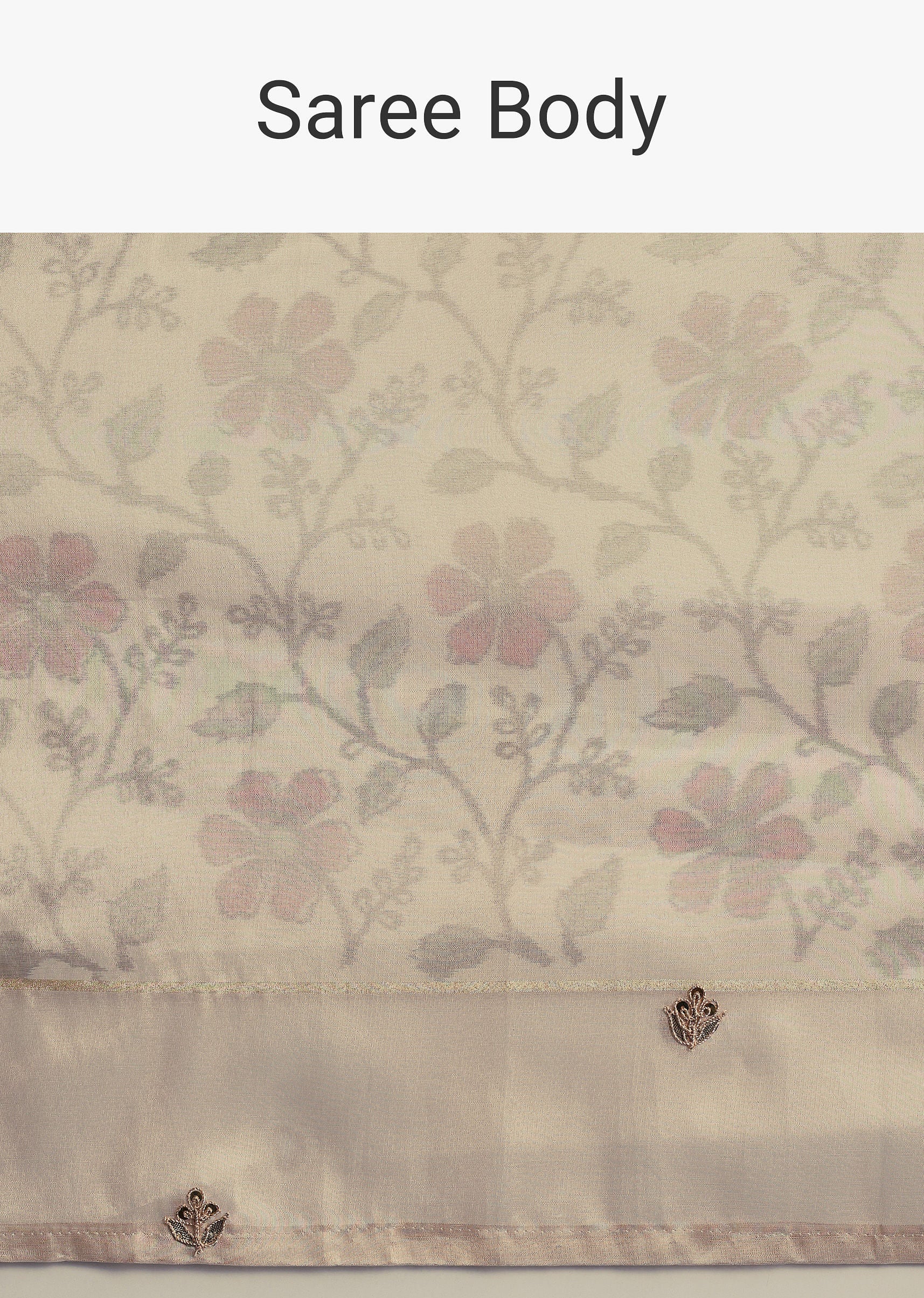 Beige Tissue Chanderi Floral Print Saree with Zardosi Work