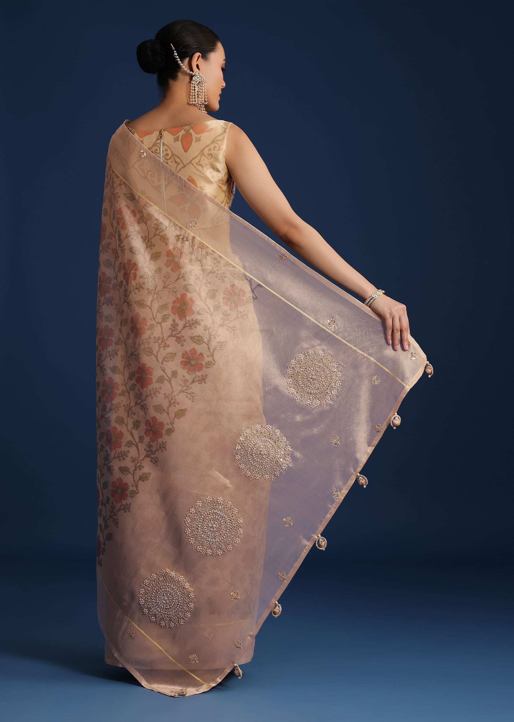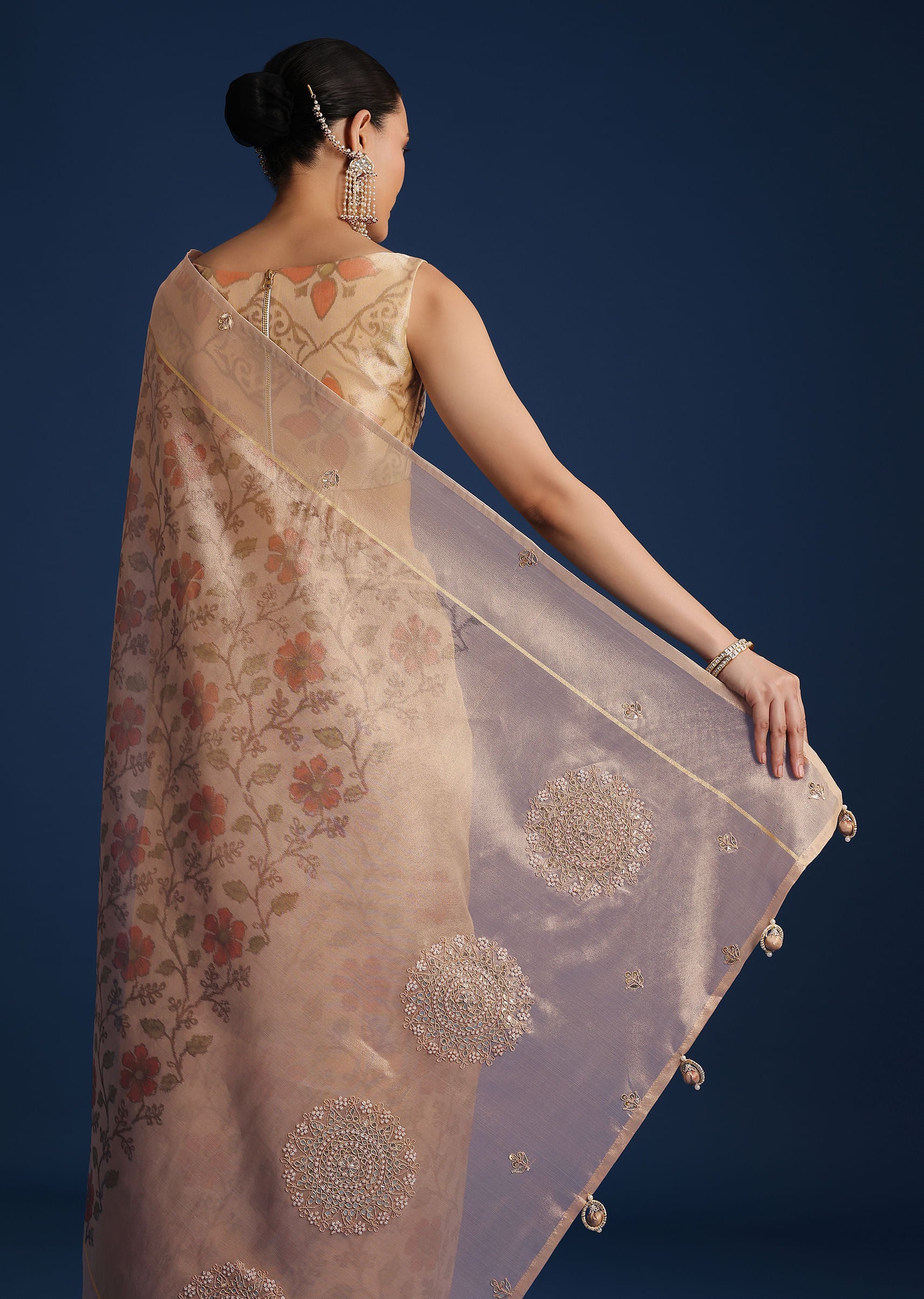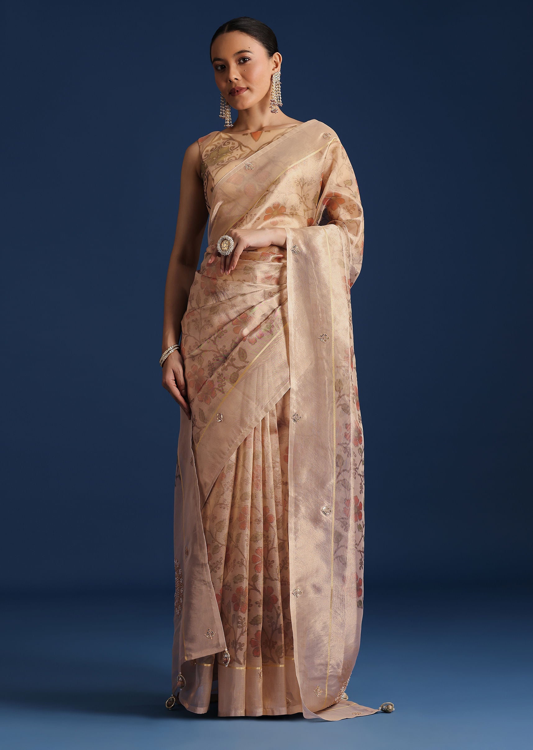 Beige Tissue Chanderi Floral Print Saree with Zardosi Work