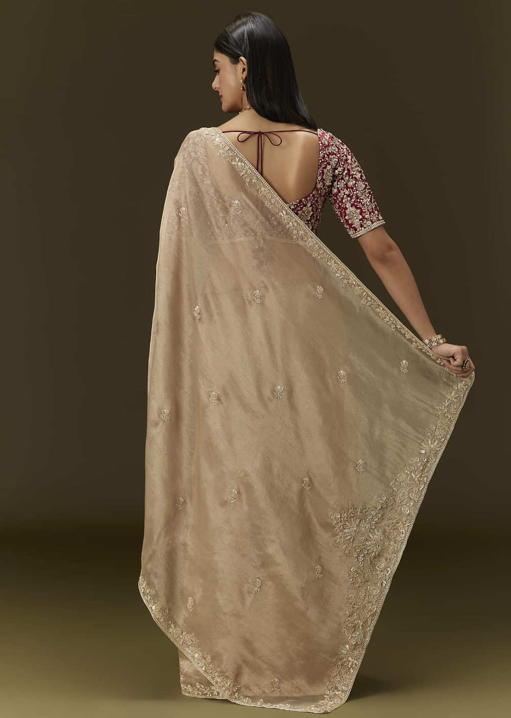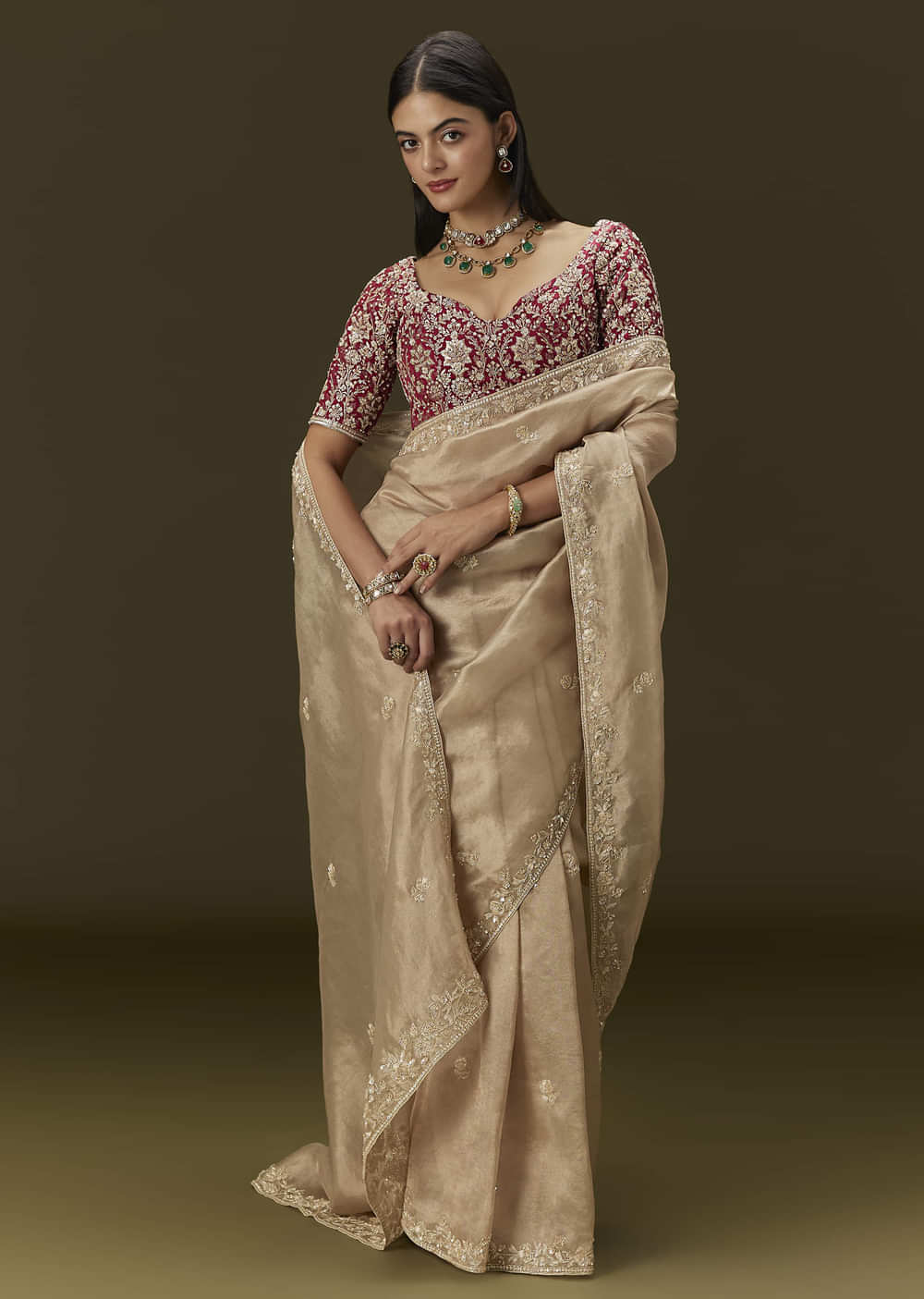 Beige Tissue Saree With Embroidered Brocade Blouse