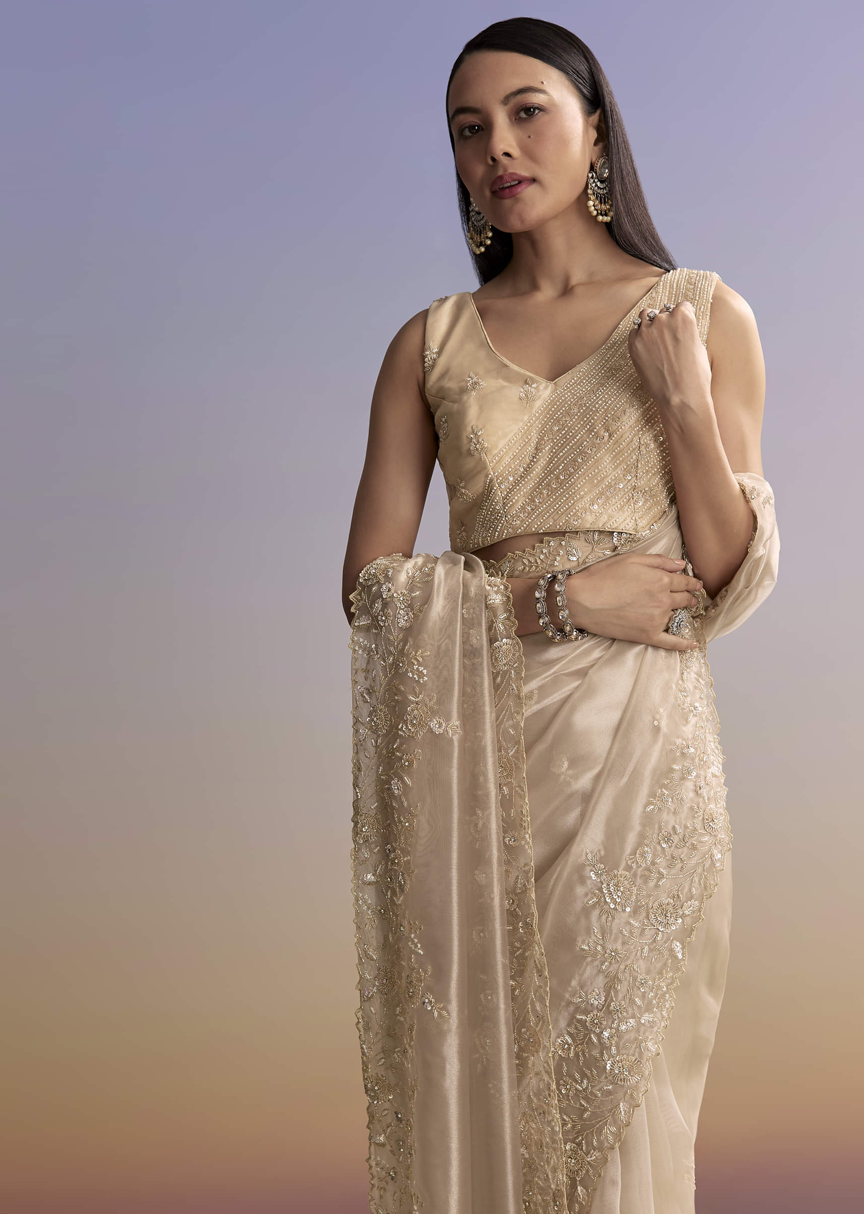 Beige Tissue Saree With Floral Embroidery And Beadwork