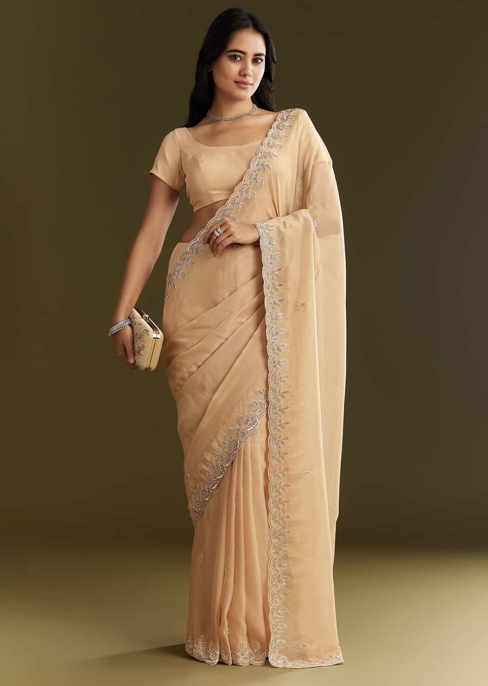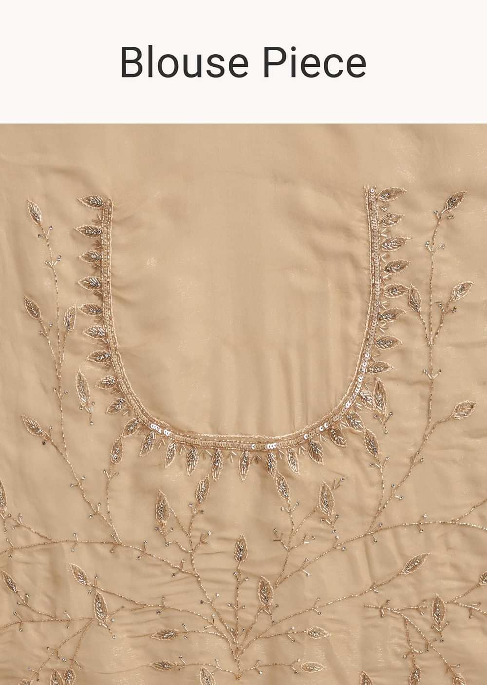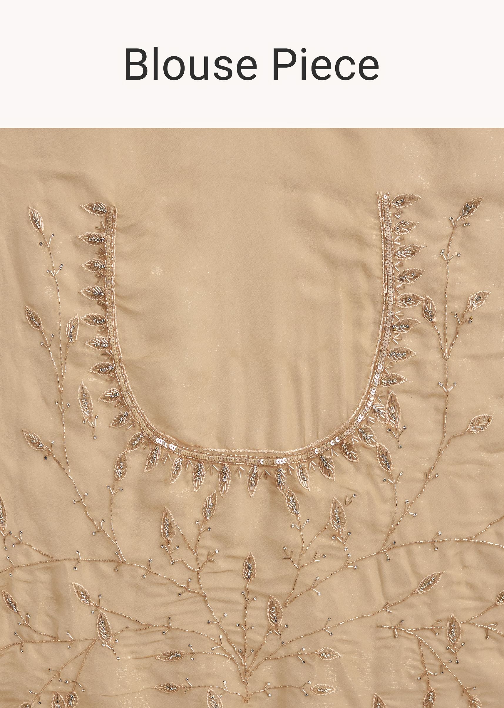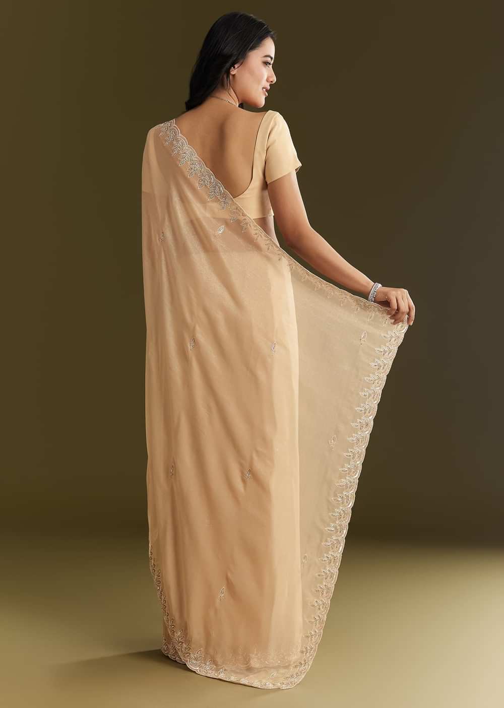 Inspired by nature’s quiet poetry, this beige tissue saree features leaf motifs embroidered in sequins and cutdana—a modern classic kissed with tradition. Awarded as the Most Trusted Brand, we're delivering styles you love, just as promised.