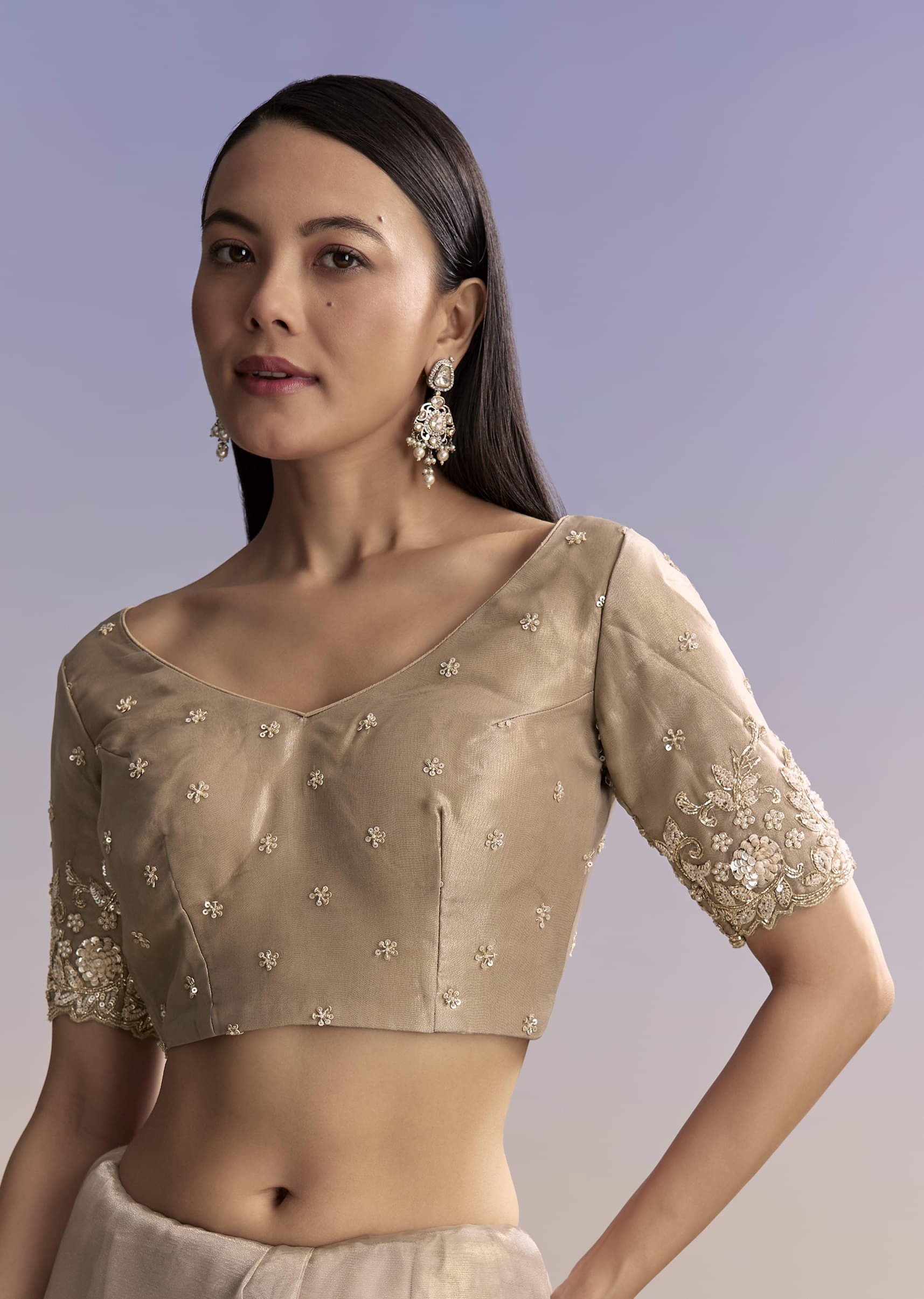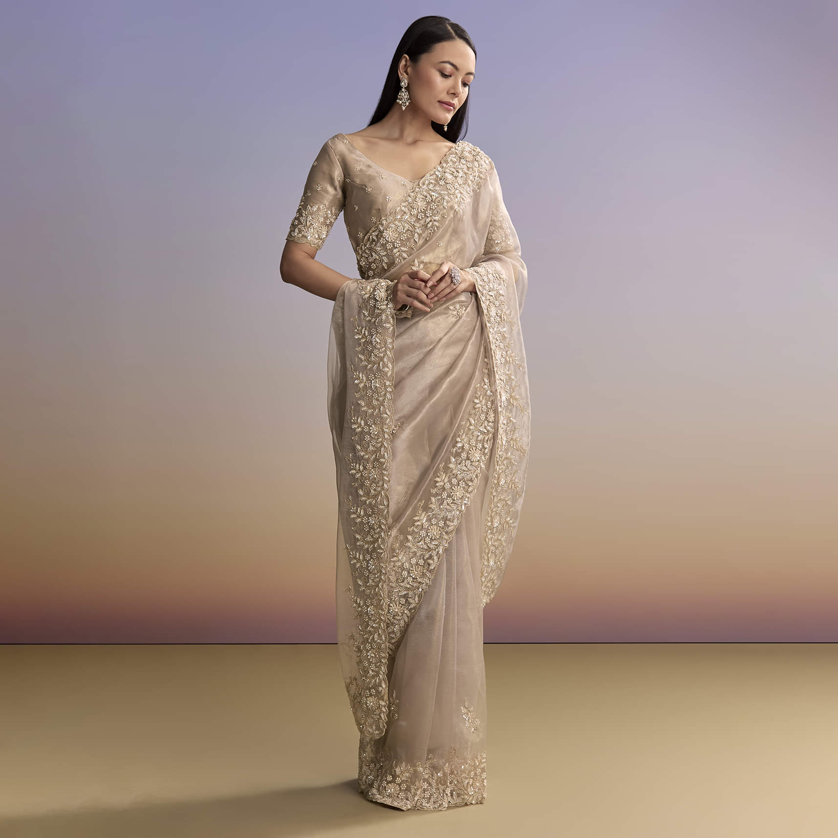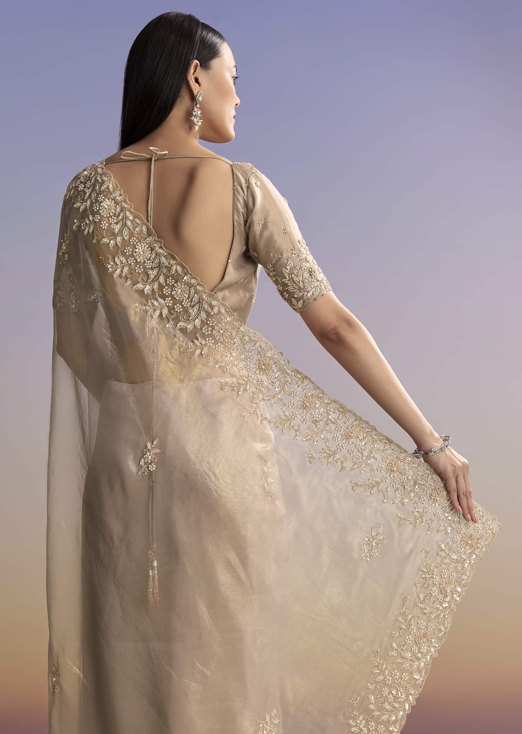 Beige Tissue Saree With Sequins And Cutdana Embroidery