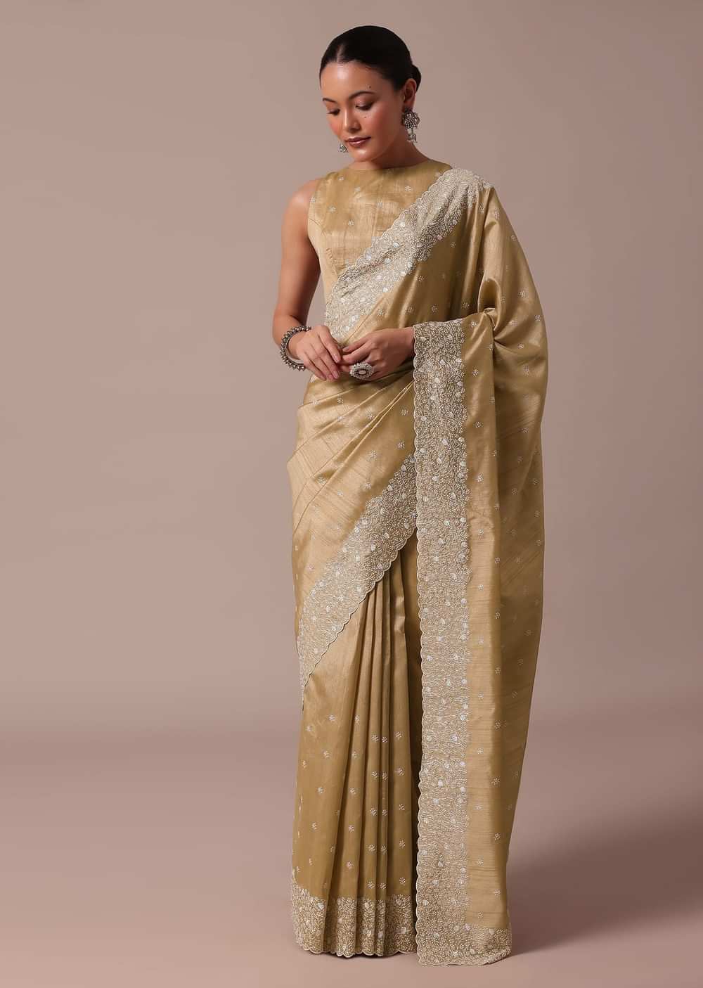 - Create an impact with this beige saree embellished with resham work along the border.