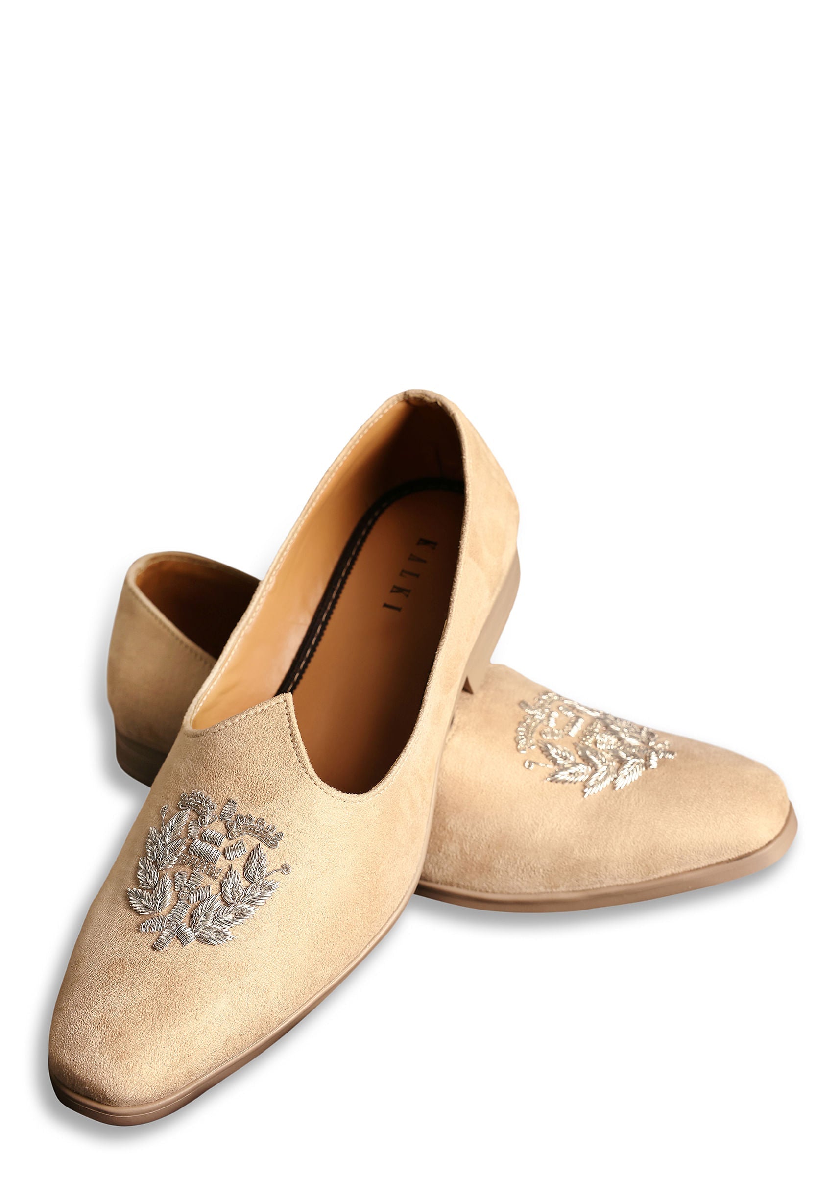 Pair the Beige Velvet Jutti with a classic sherwani or kurta-pajama set in earthy tones like ivory beige or gold.