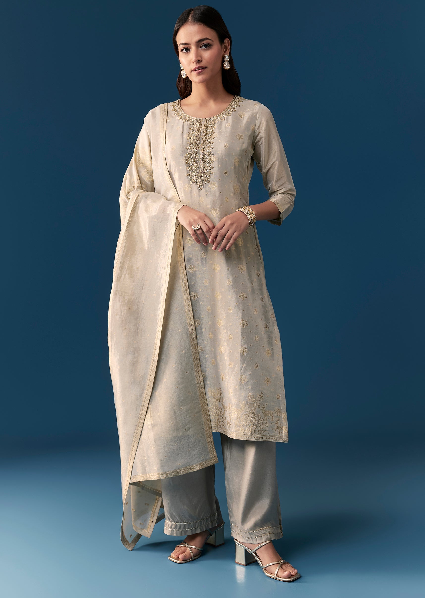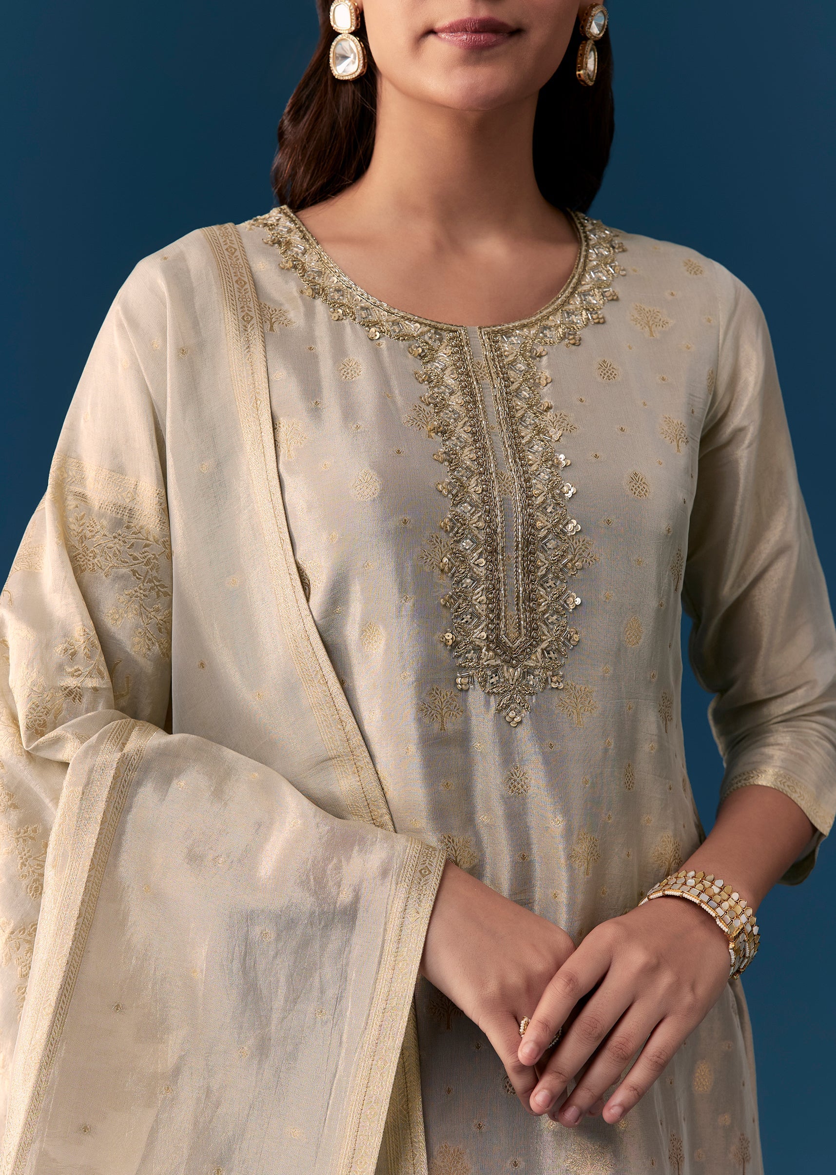 Beige Weave Kurta Set With Zardosi And Cut Dana Work