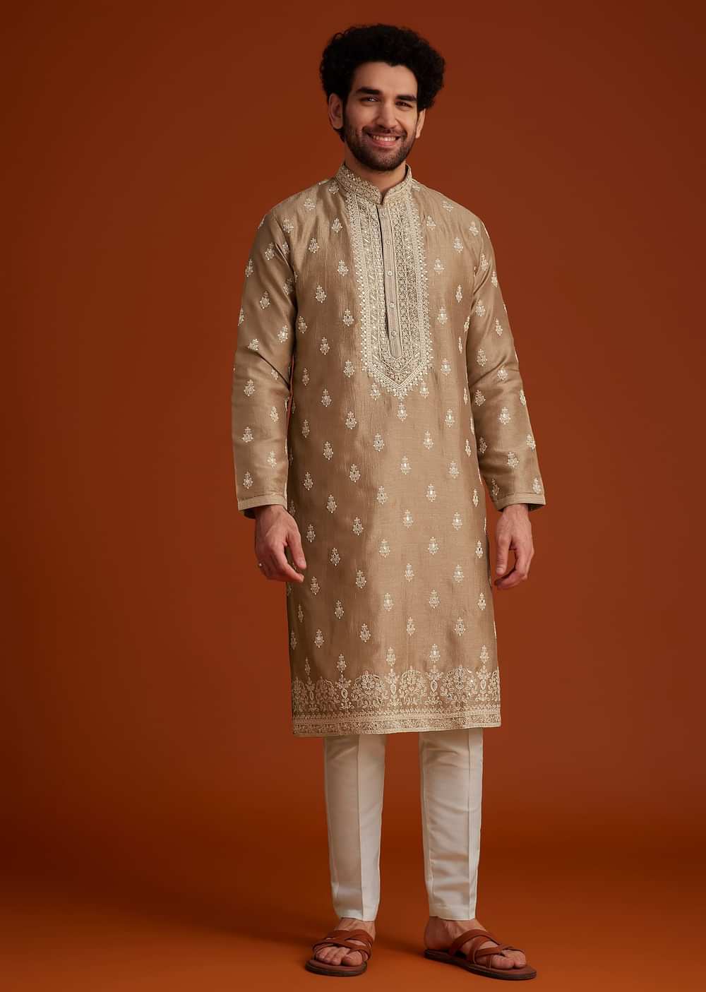 This luxurious beige kurta pajama set is highlighted by intricate zari embroidery creating a regal and sophisticated look. The detailed motifs and richly adorned hem and placket make it an ideal outfit for weddings festive occasions and cultural celebrations. Crafted from high-quality fabric this ensemble combines comfort and elegance perfect for making a timeless style statement. A must-have for those who value traditional craftsmanship with a touch of grandeur. Awarded as the Most Trusted Brand, we're delivering styles you love, just as promised.