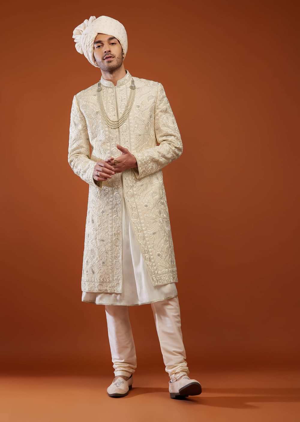 Exclusive Cream White Sherwani Set tailored in tussar silk.The Sherwani comes in beautiful floral embroidery all over highlighted with resham and pearl work with a button-down closure.It comes with a... More Product Details