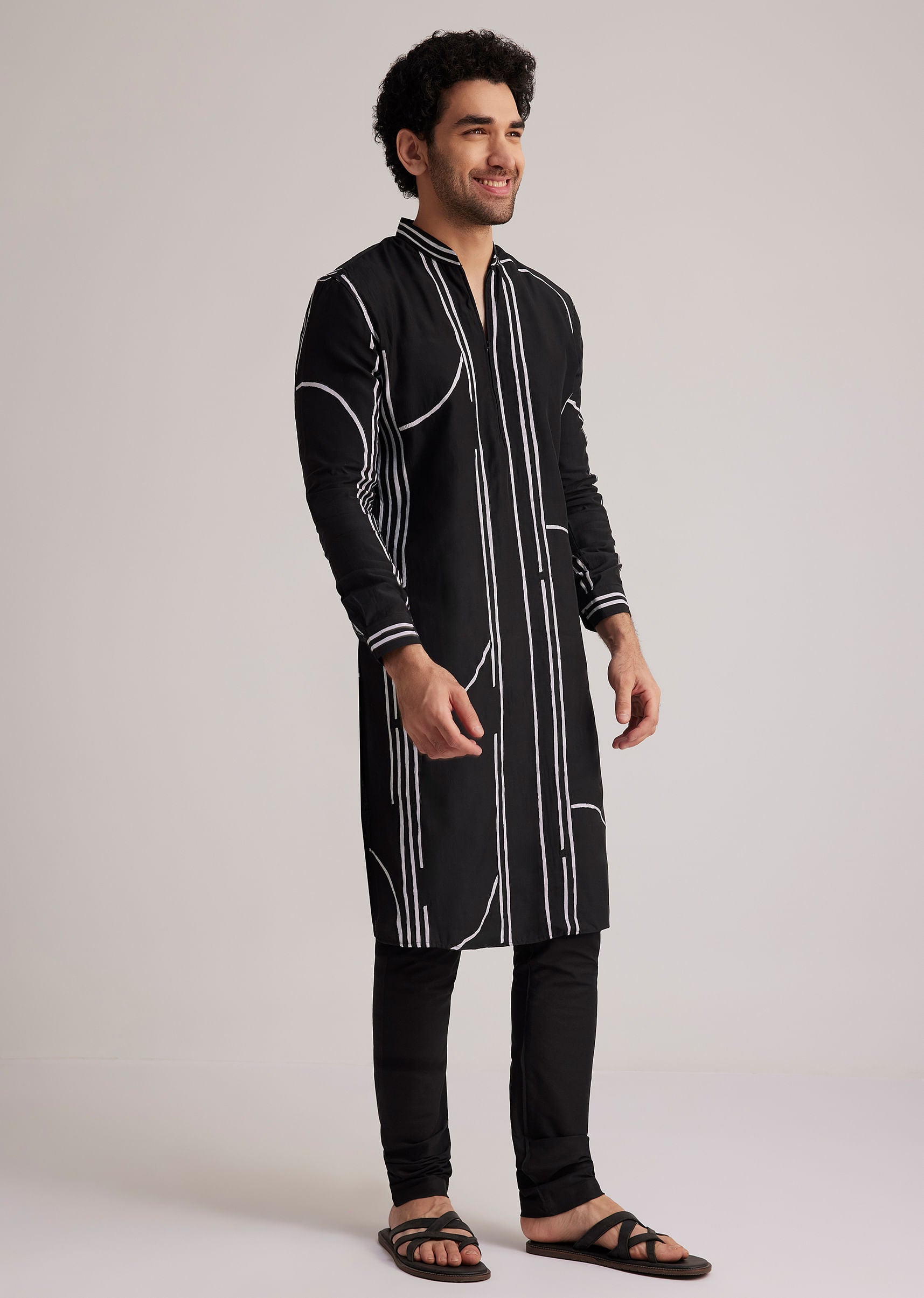Make a bold statement with this black kurta set, featuring striking white abstract prints that add a contemporary edge to traditional wear. Perfect for festive evenings, casual gatherings, or art-inspired... More Product Details