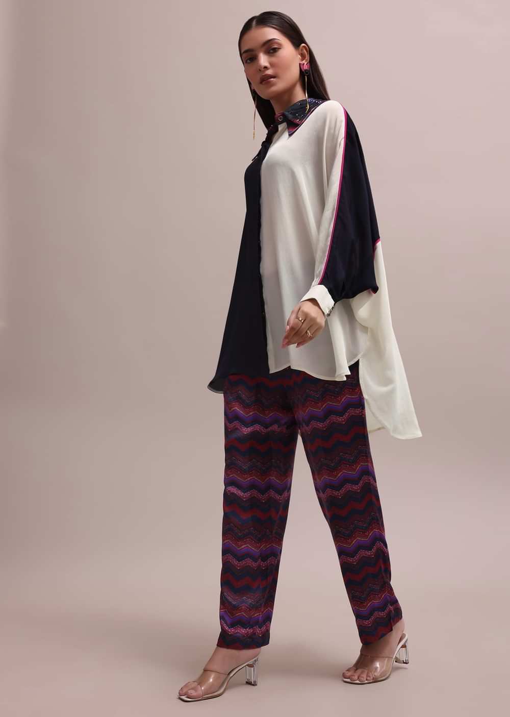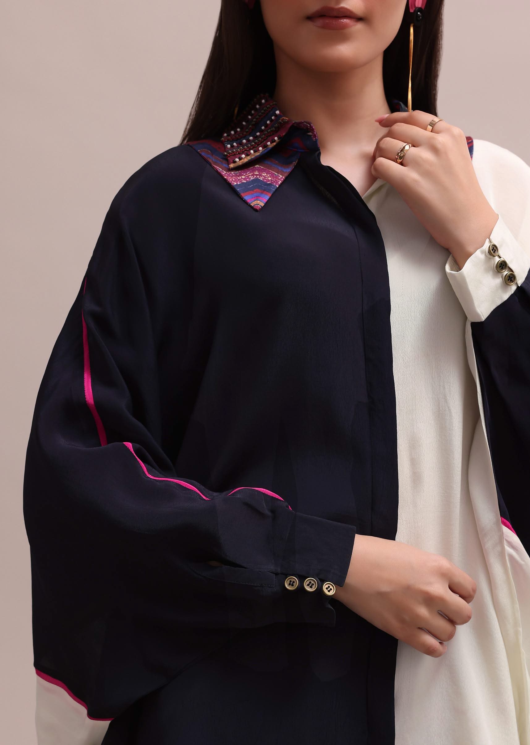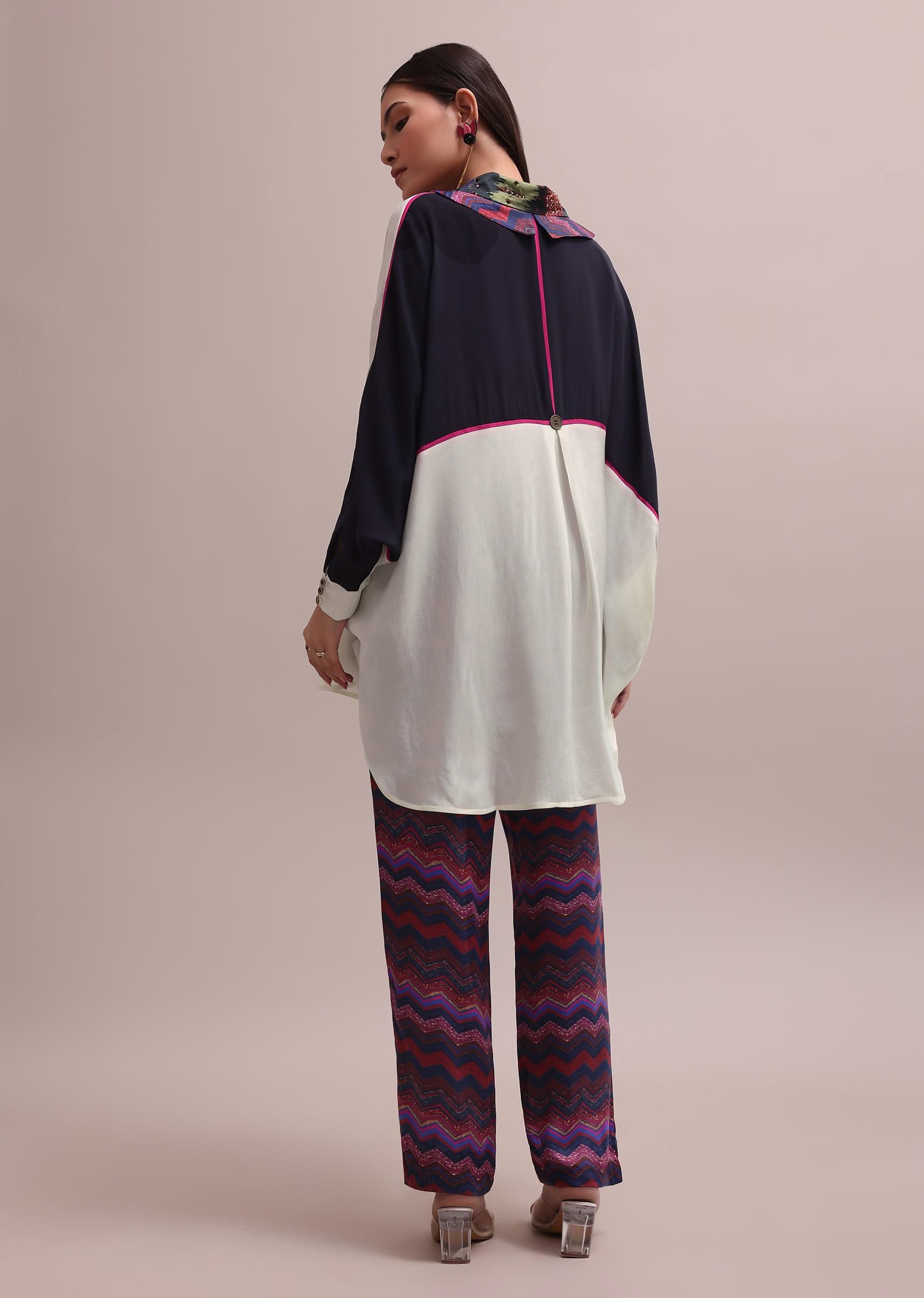 Black And White Color Block Kurta With Embroidered Collar And Striped Crepe Pants Set