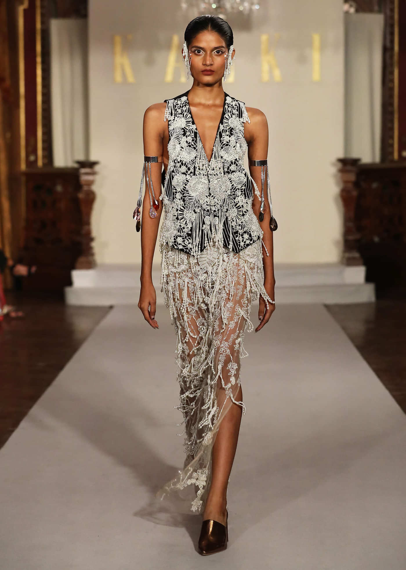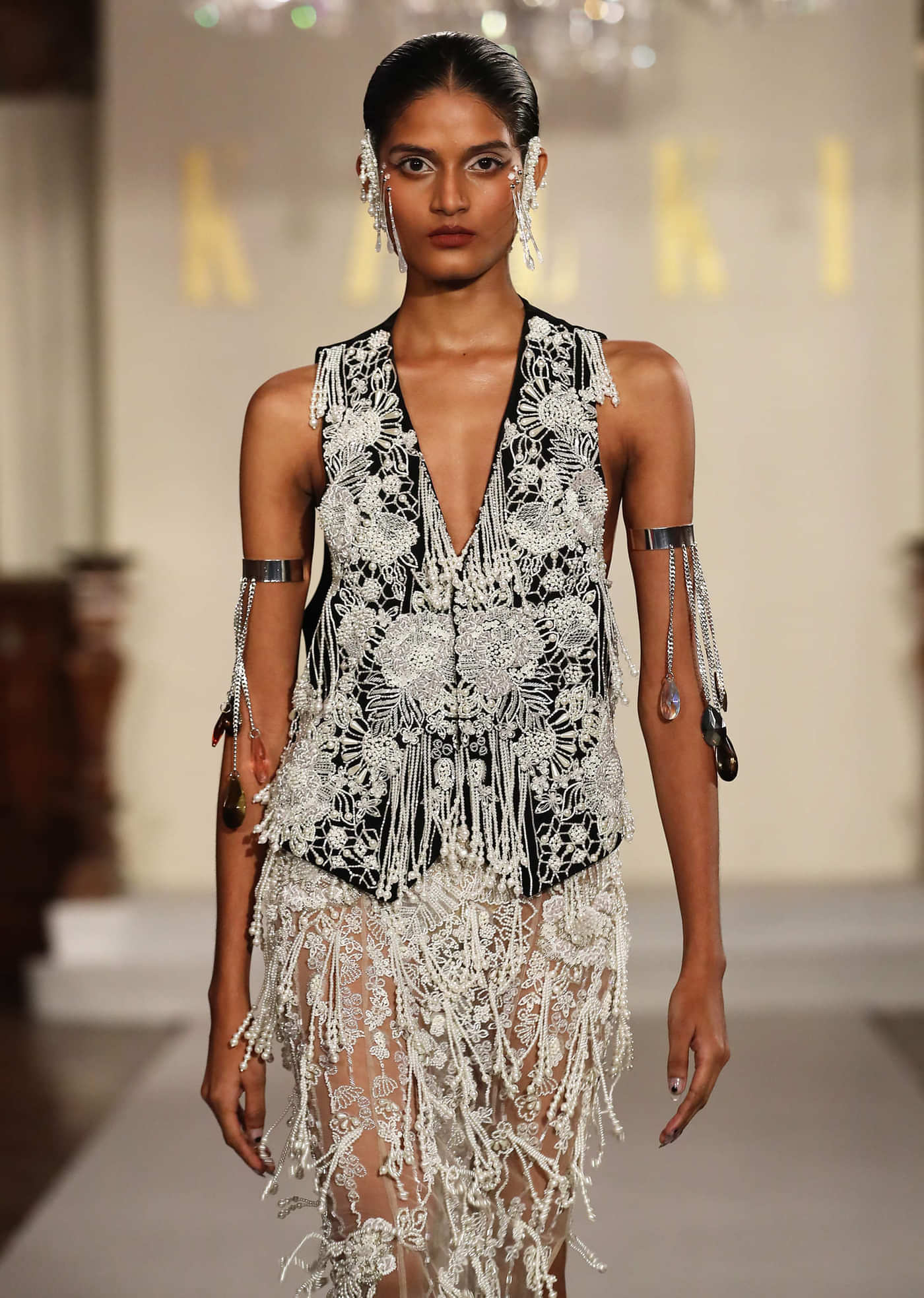 A play of contrasts defines this black and white bridal Indo-western skirt set that makes a bold statement. The tassel embroidered waistcoat moves with pearls and beads for a couture... More Product Details