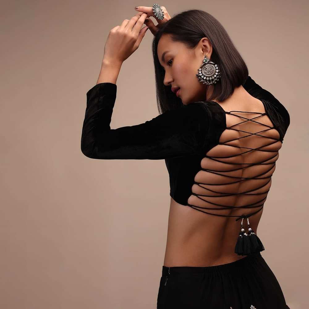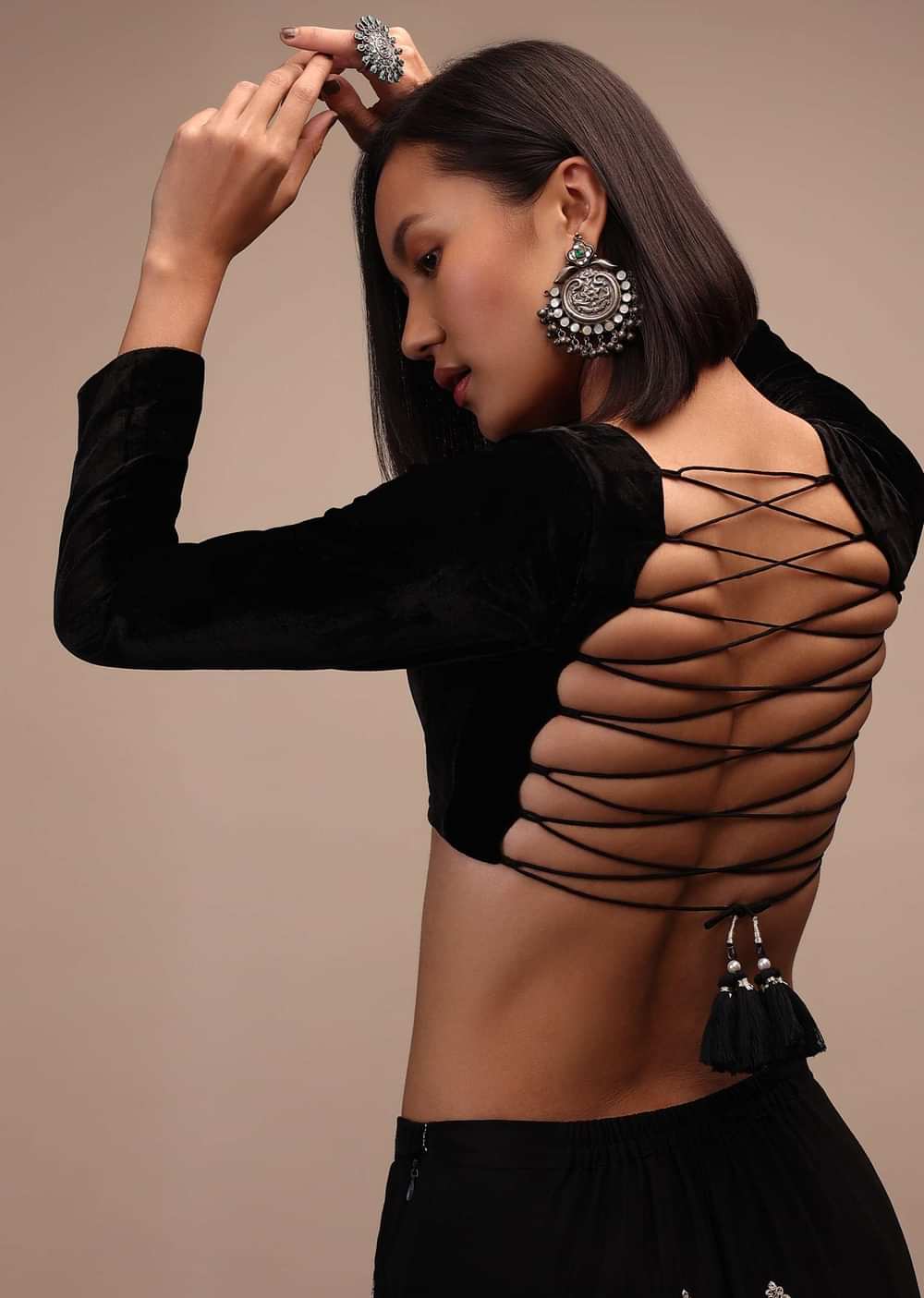 Black backless blouse in velvet with a criss-cross tie-up. Cast in straight hemline with adjustable tassel Dori. This piece will definitely add a trace of class into your fashion statement.... More Product Details