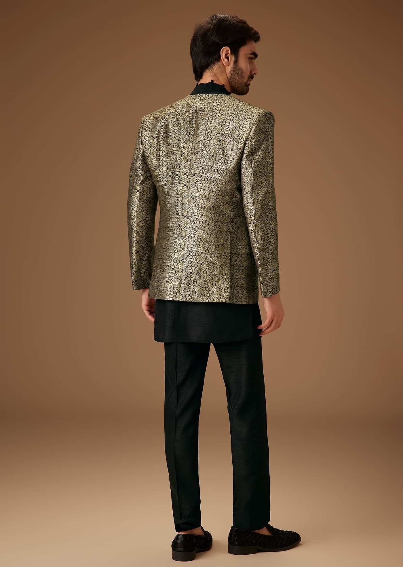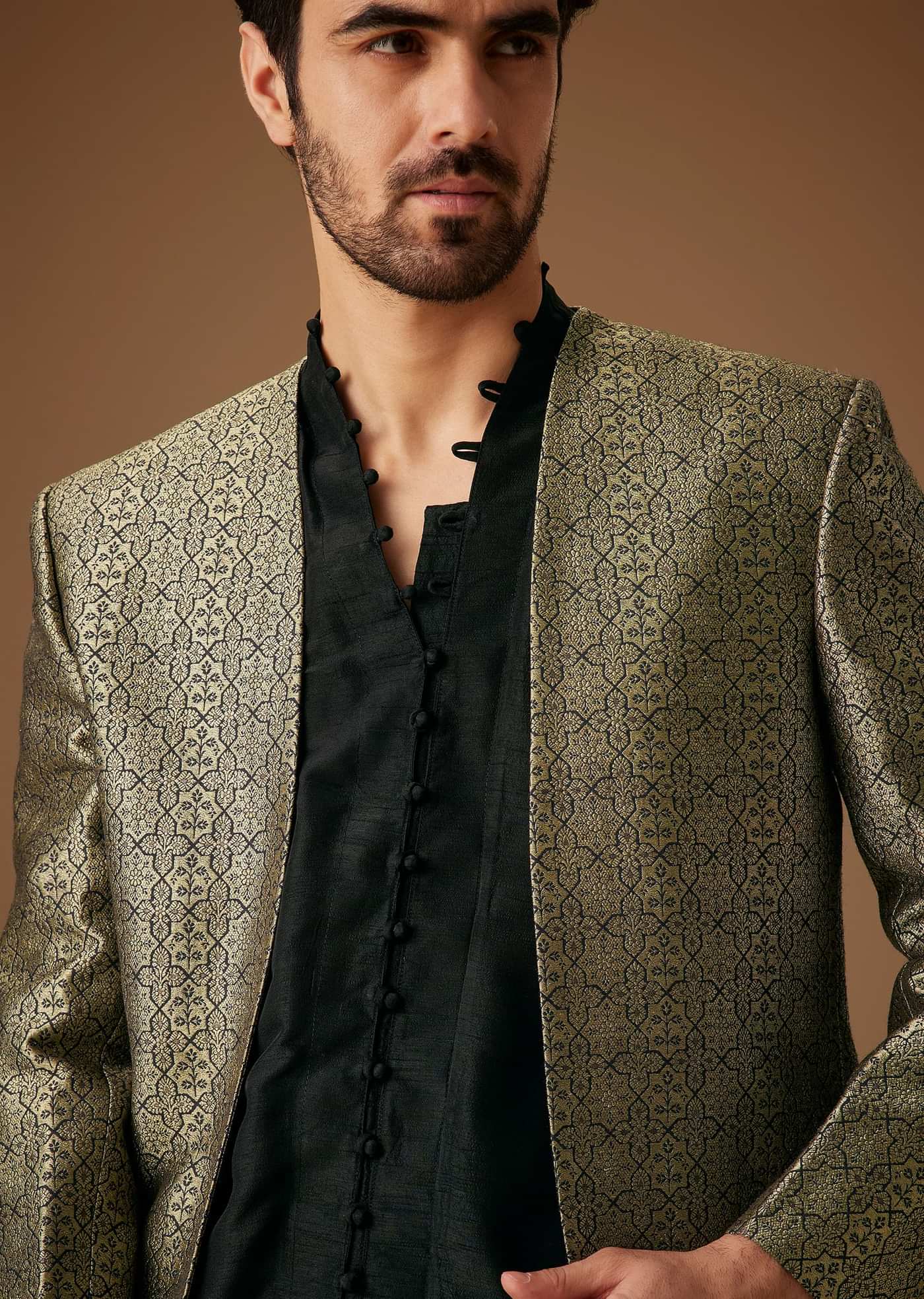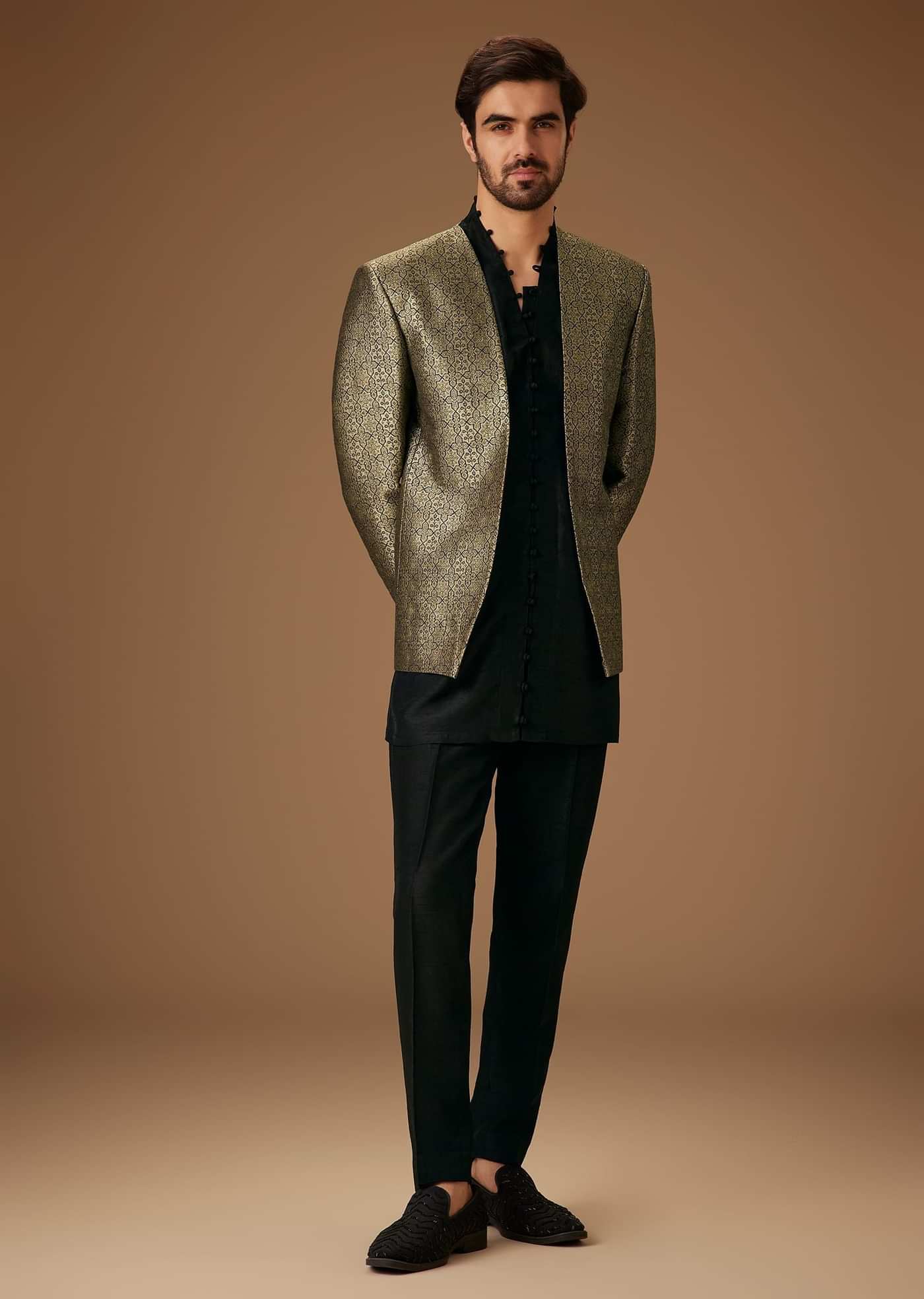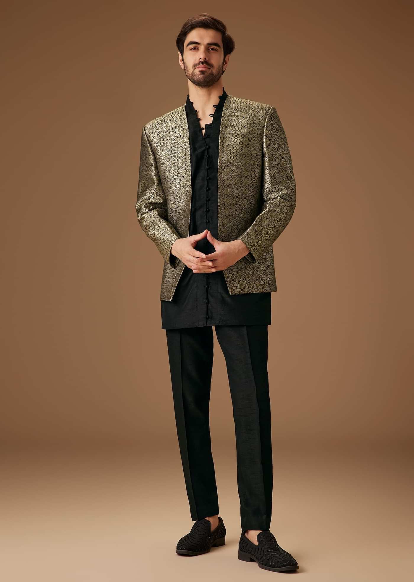 Step Into Sophistication With This Meticulously Crafted Black Indowestern Bandi Set A Fusion Of Traditional Grandeur And Contemporary Finesse. The Rich Banarasi Silk Open Bandi Adorned With Intricate Weaving Exudes... More Product Details