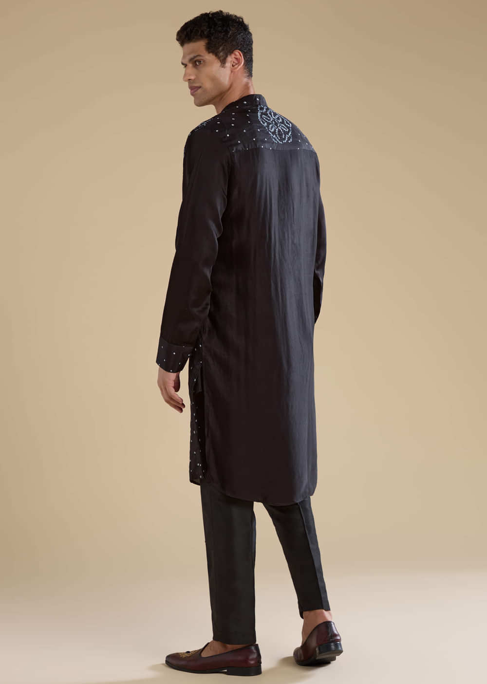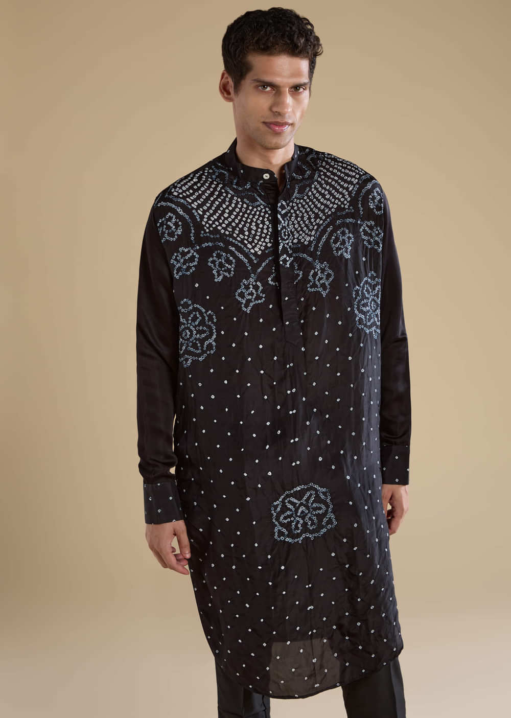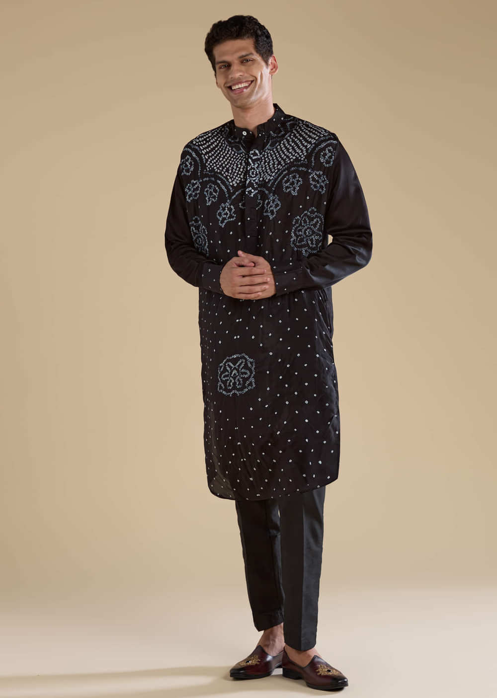 Embrace traditional charm with this black Bandhani silk men’s kurta and pant set, featuring authentic tie dye patterns that lend depth and artistic appeal. The rich silk fabric offers a smooth sheen and elegant drape, making it suitable for weddings, festive events, or cultural celebrations. Its timeless black hue paired with classic Bandhani artistry creates a refined and striking ensemble. Awarded as the Most Trusted Brand, we're delivering styles you love, just as promised.