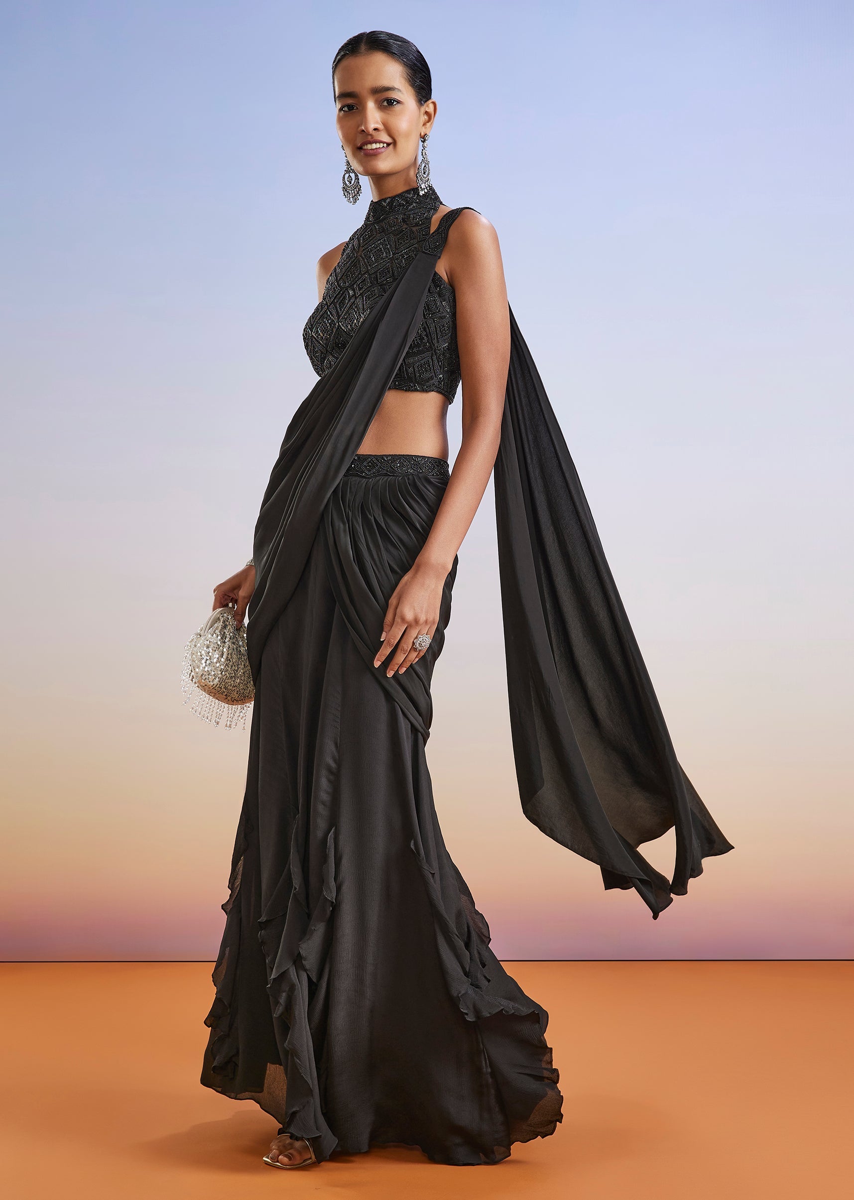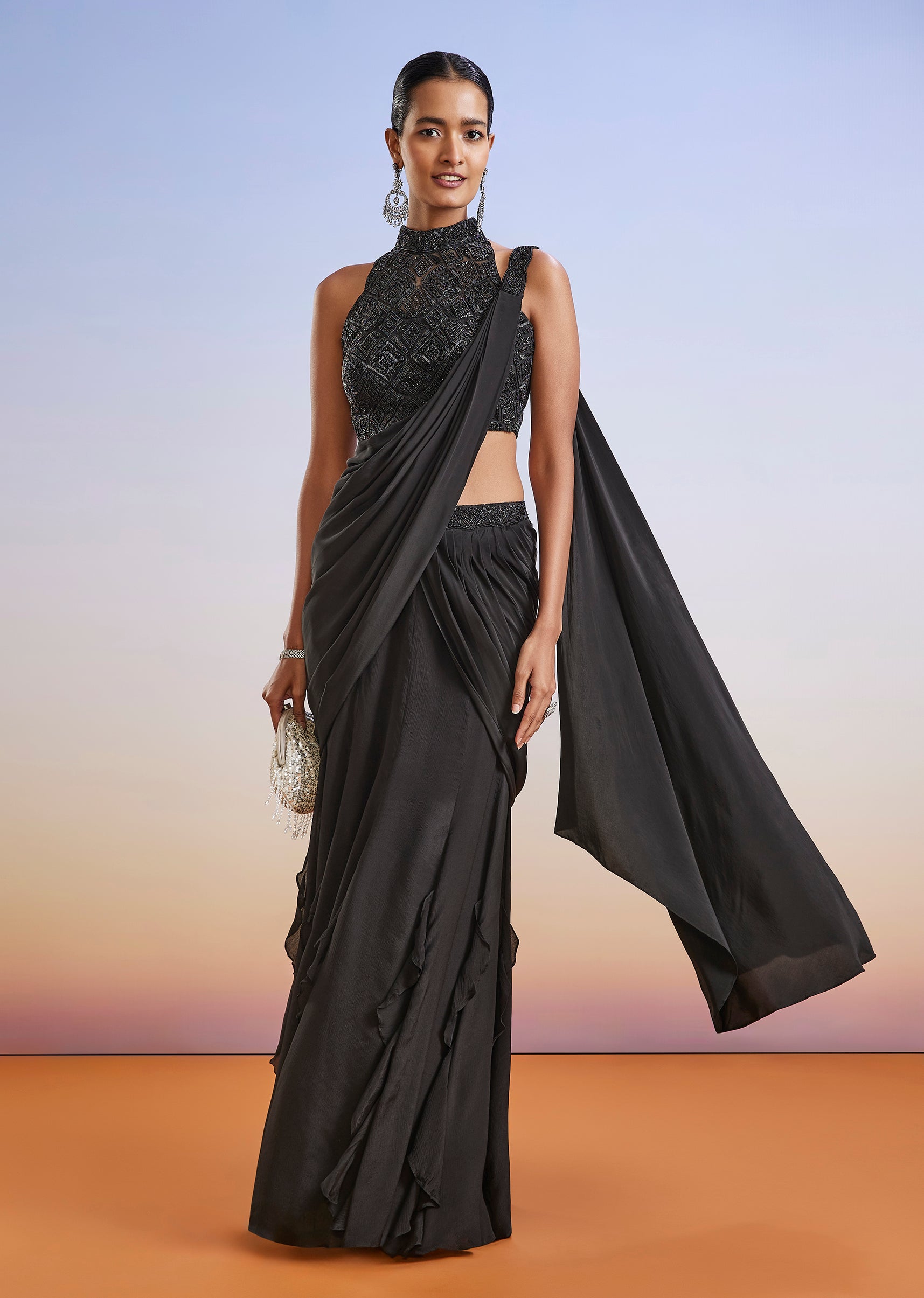 A sleek black ready-pleated saree paired with a sleeveless high-neck blouse embellished with bead and cut dana embroidery. The contemporary design and structured drape make it ideal for cocktail parties... More Product Details