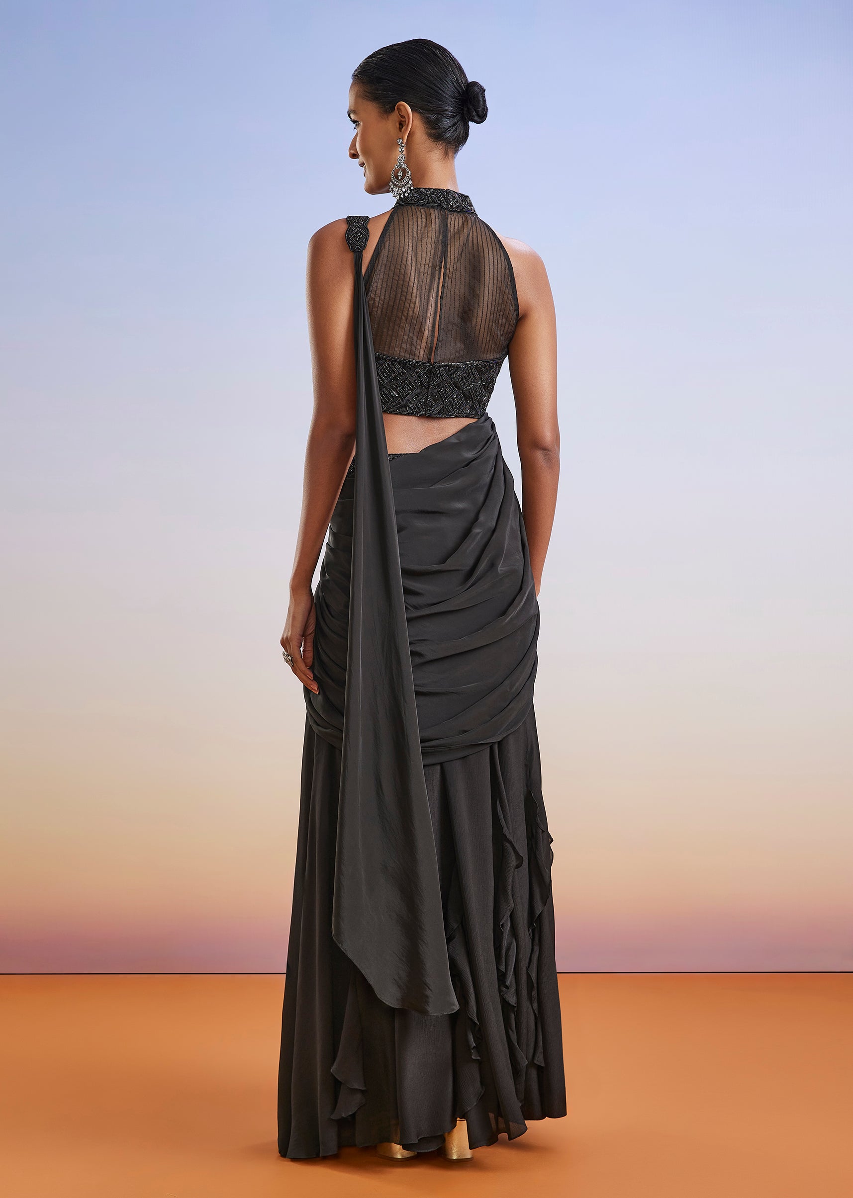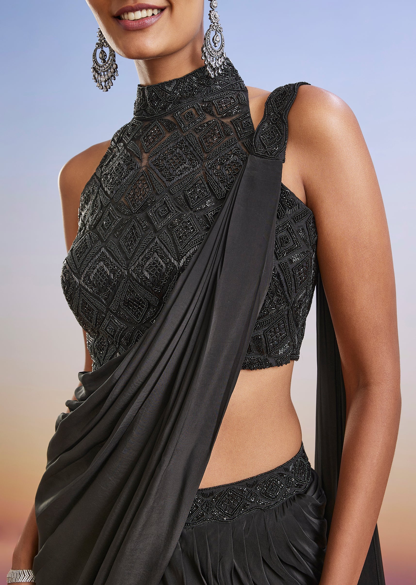 Black Beaded Embroidered Ready Pleated Saree With Blouse