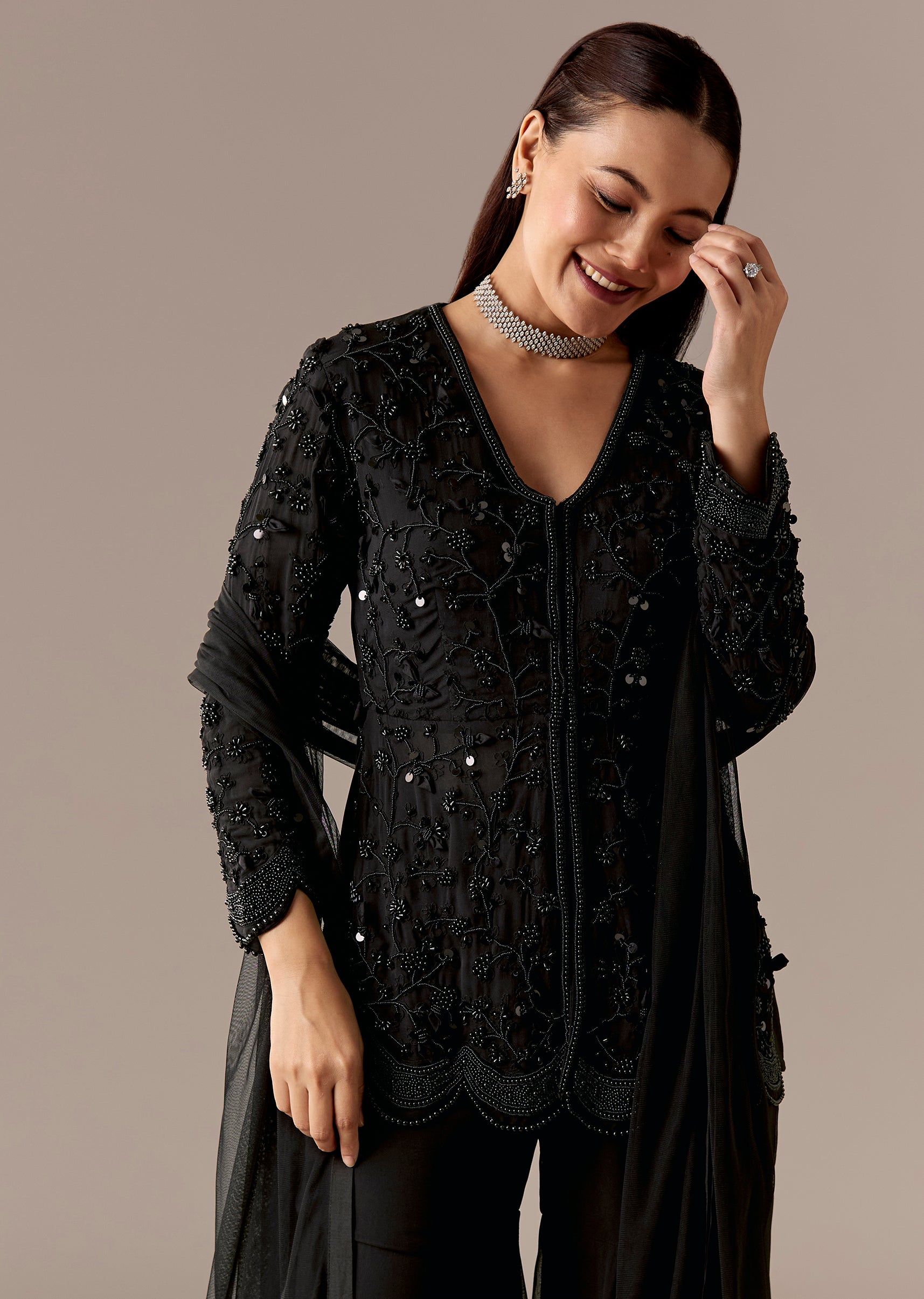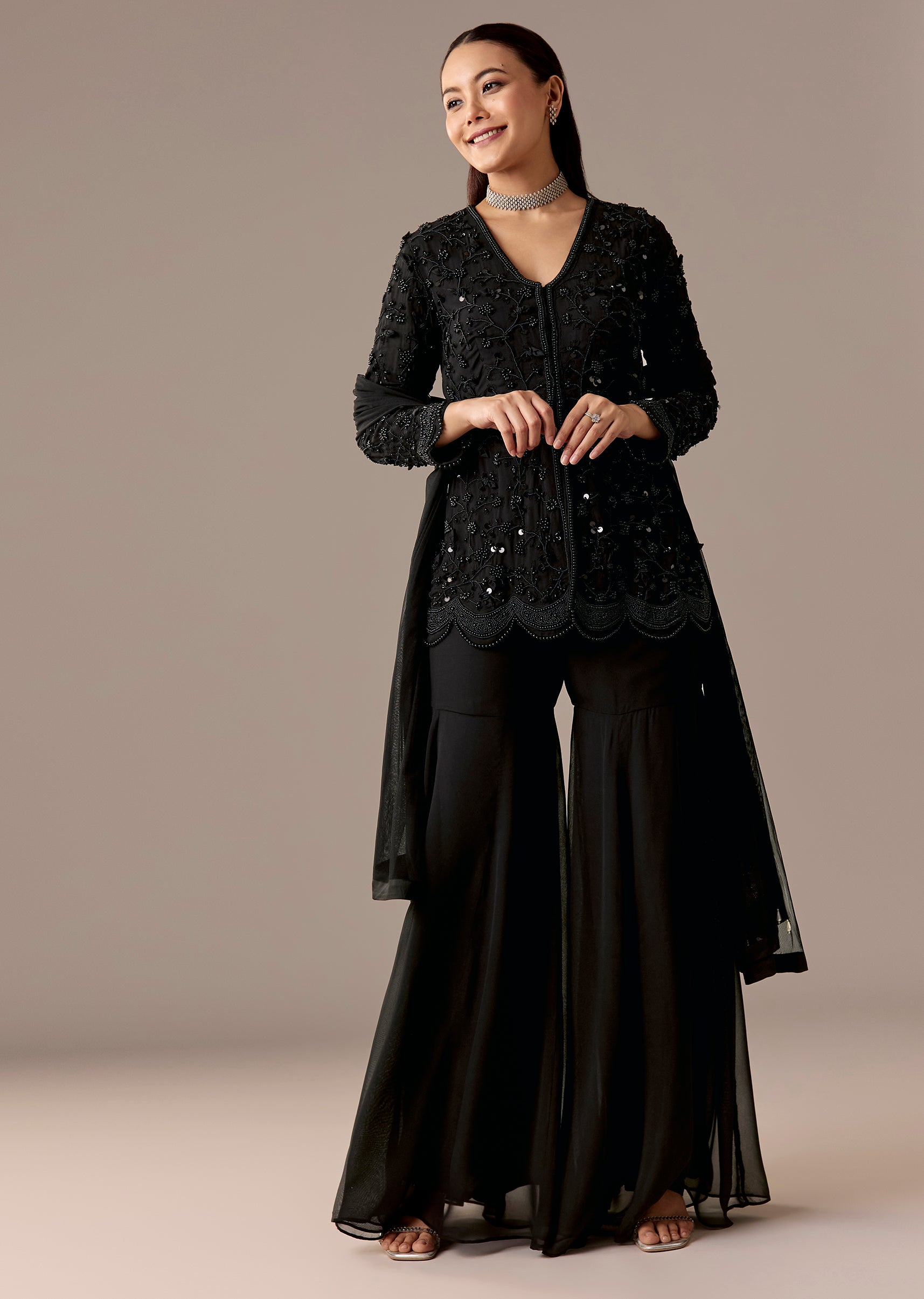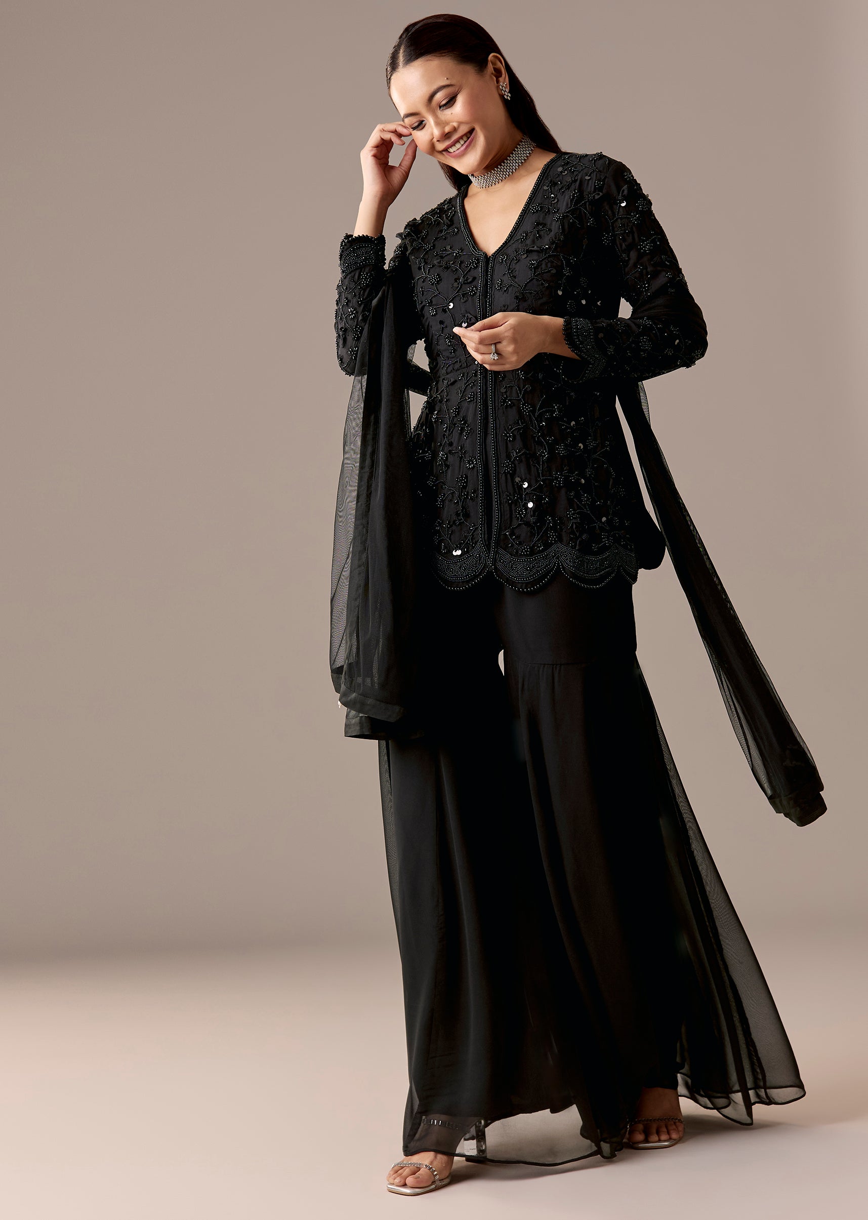 A contemporary black peplum-style kurta set with beadwork, paired with a flared sharara and dupatta. 3/4th sleeves, V-neckline, and front hook-eye closure—perfect for sangeet and reception.Awarded as the Most Trusted... More Product Details