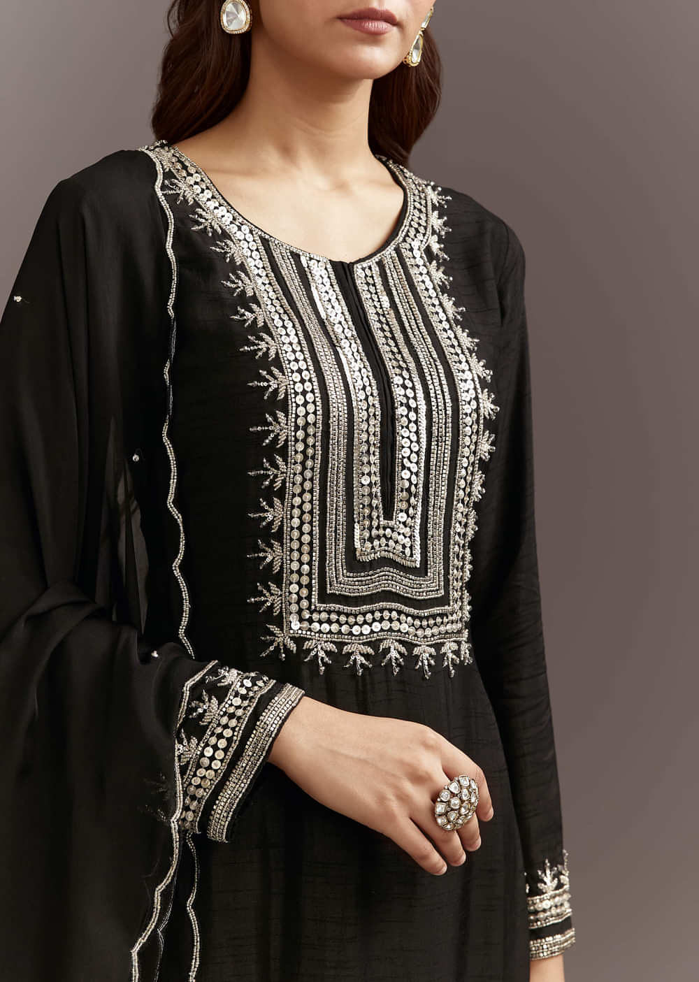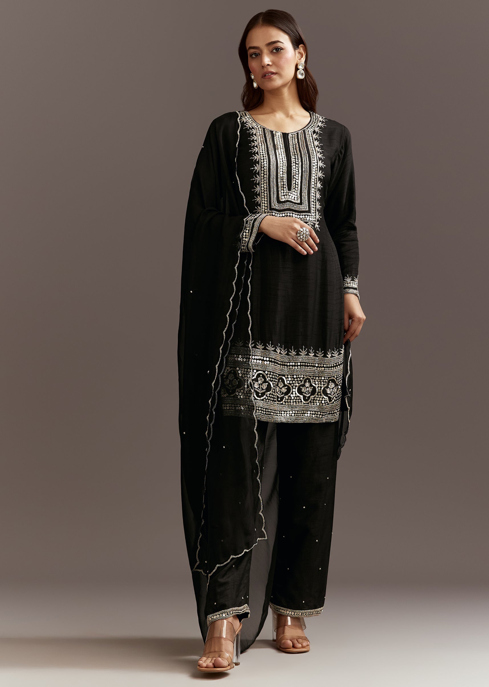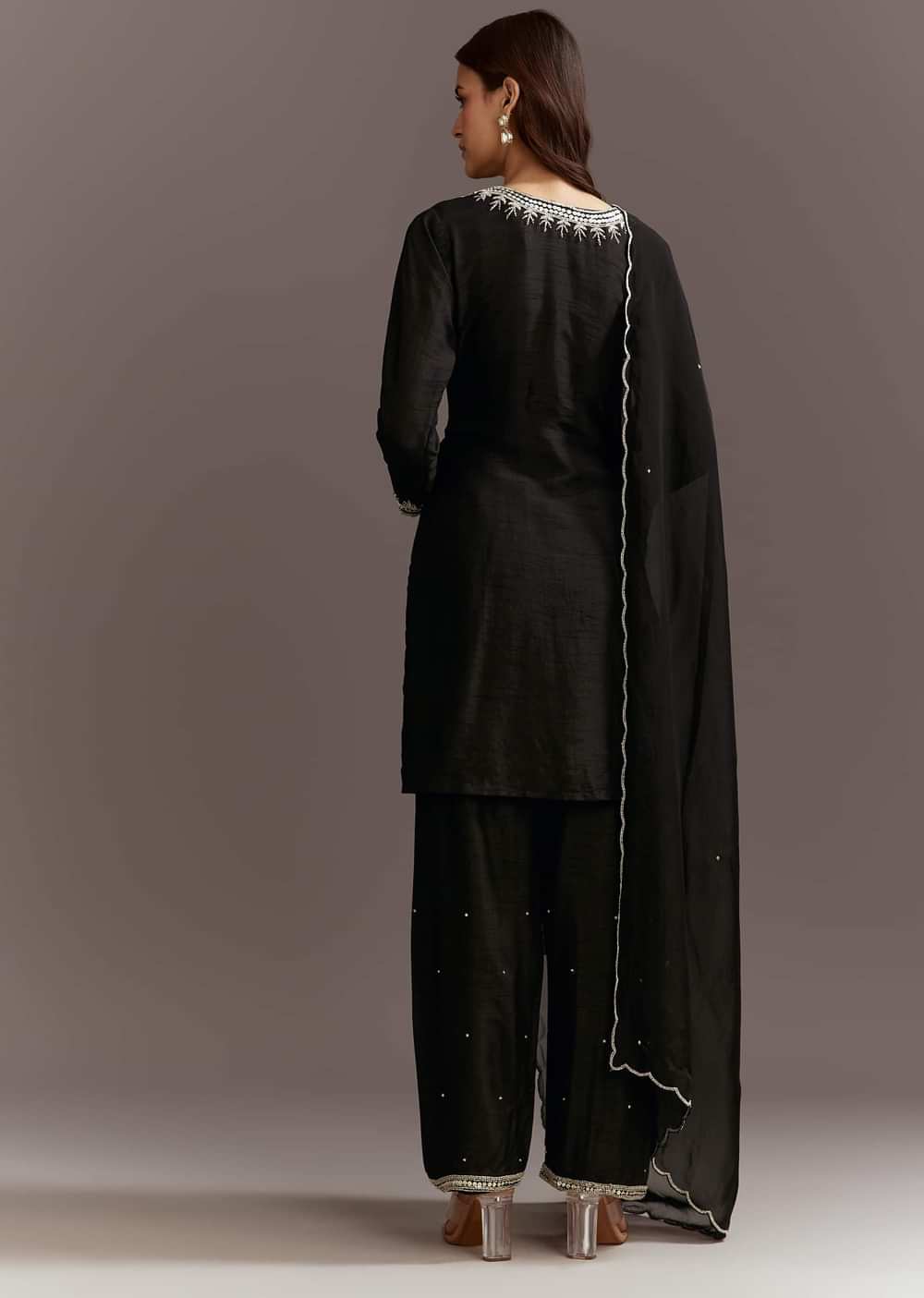 This black silk kurta is embellished with beads and sequins and paired with a scallop edged organza dupatta. A statement choice for mehendi celebrations.Awarded as the Most Trusted Brand, we're... More Product Details