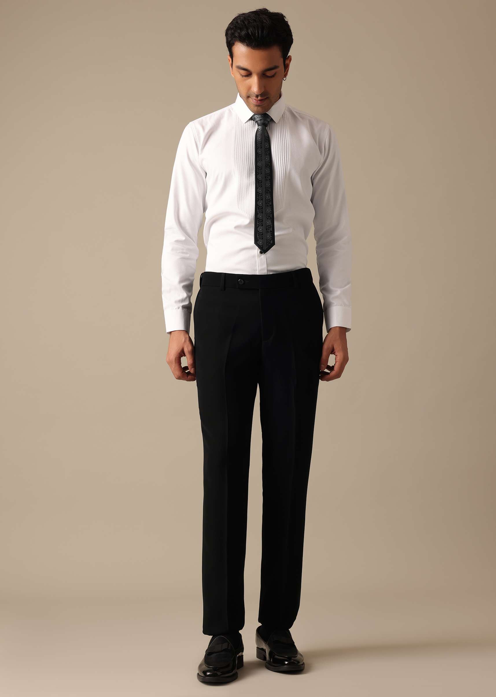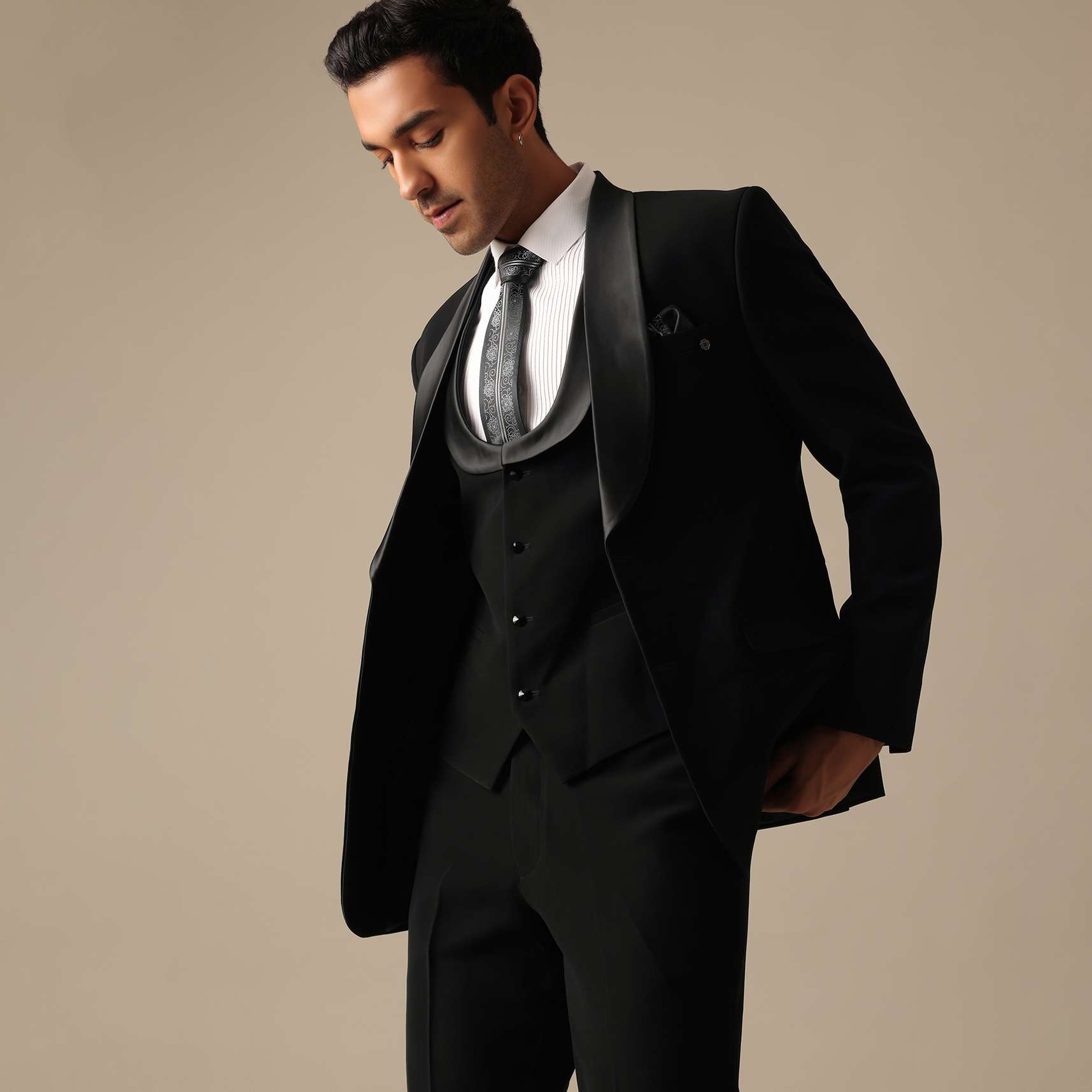 Introducing our black tuxedo set that is the perfect blend of elegance and luxury. Ideal for weddings and receptions, this five-piece ensemble displays exquisite cutwork detailing that ensures a dapper visual appearance.Enhanced with a stylish design, this attire includes a matching shirt, tie, waistcoat and trousers. Awarded as the Most Trusted Brand, we're delivering styles you love, just as promised.