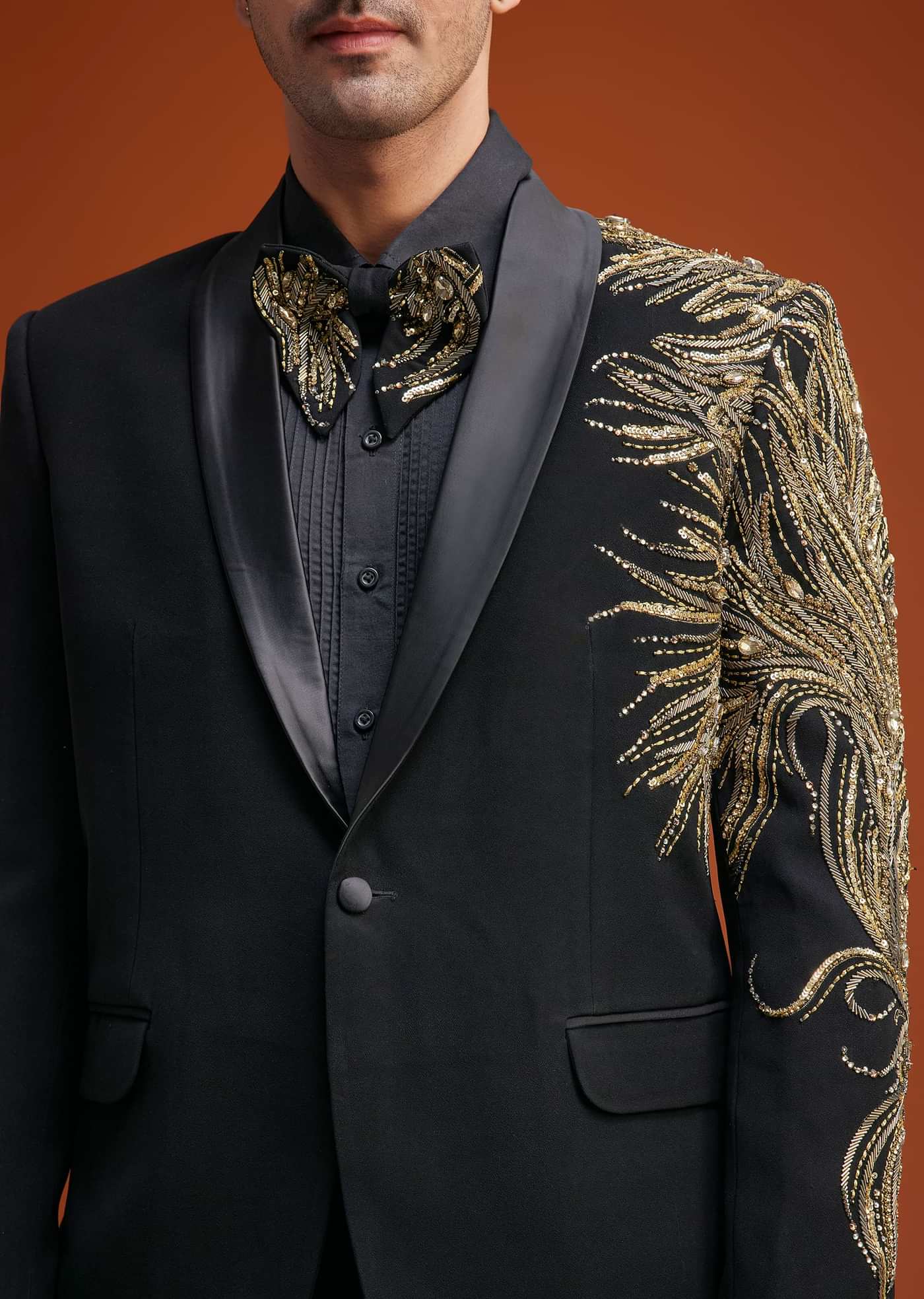 • This striking black blazer showcases an asymmetrical design adorned with intricate gold sequin and bead embroidery on one shoulder and sleeve.