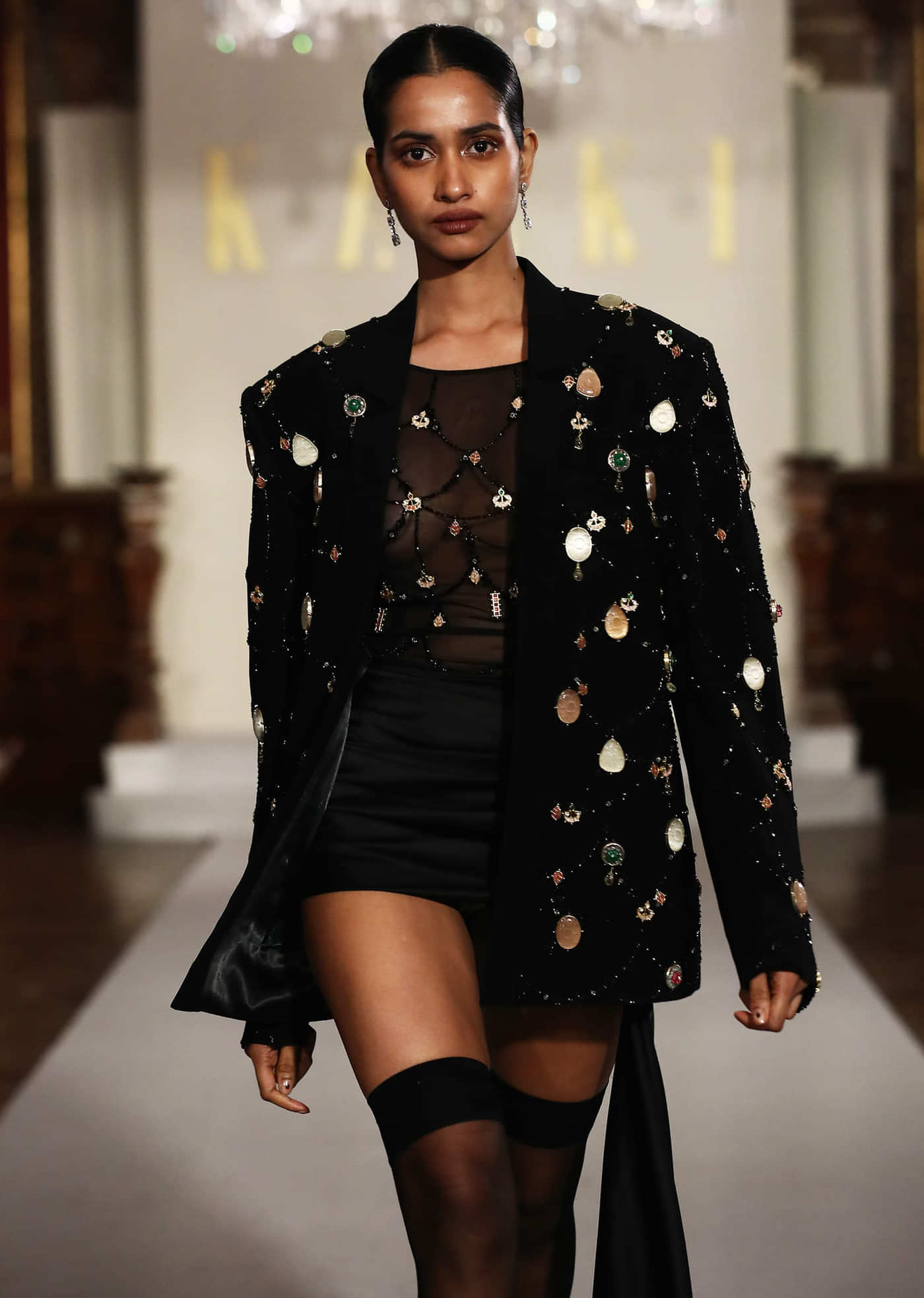 This black bridal Indo western drape set in imported suiting fabric carries a bold couture edge with its oversized jacket silhouette. Embellished with stones, cutdana, and beads, the jewelled embroidery... More Product Details