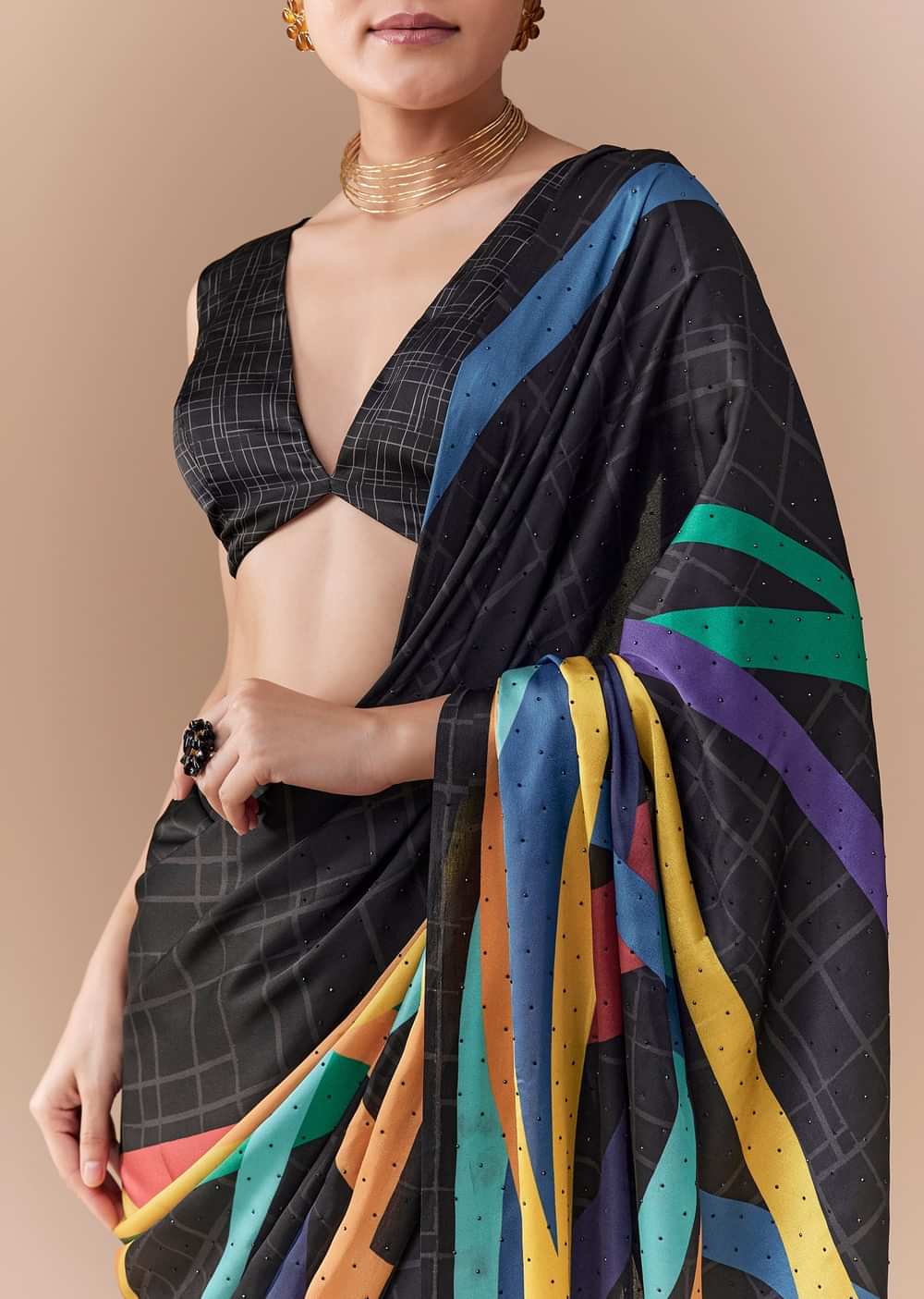 Add a touch of contemporary flair with this black satin saree, featuring a chic checks-printed texture and vibrant multicolor stripes all over. The saree is elegantly embellished with sparkling stones, adding a hint of glamour to its modern design. Crafted in smooth satin fabric, it offers a graceful drape and subtle sheen, perfect for festive occasions, evening events, or celebrations. Awarded as the Most Trusted Brand, we're delivering styles you love, just as promised.