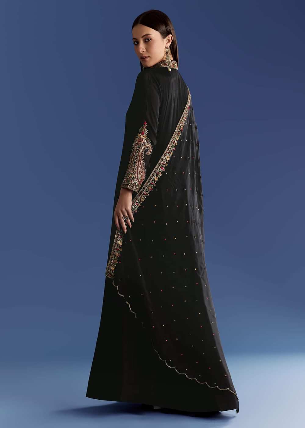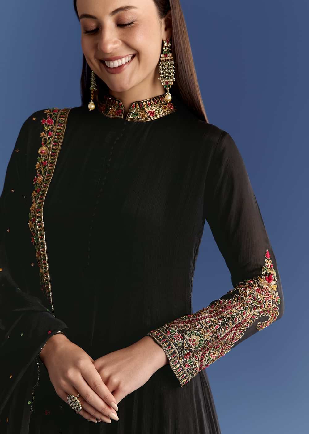 Black Chinon Anarkali With Embroidered Collar And Zari Dupatta
