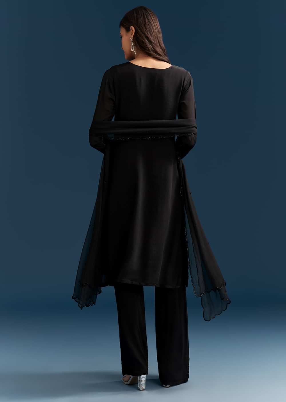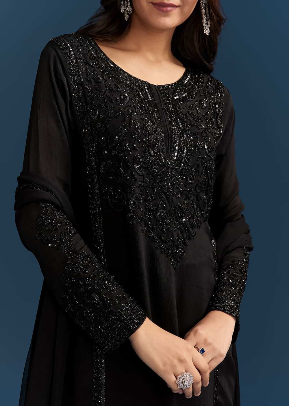 Black Chinon Kurta Set With Sequins And Cut Dana Work