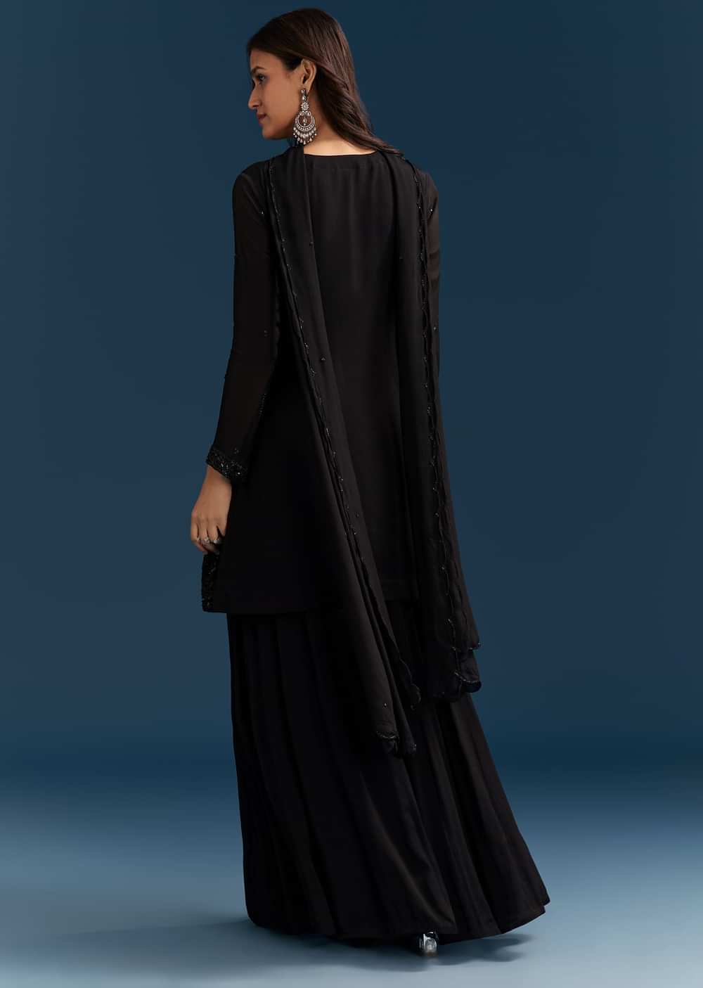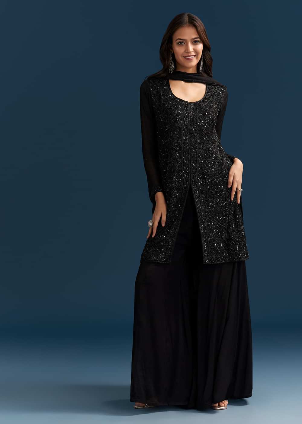 A timeless black palazzo suit detailed with cut dana and sequins work. This Pakistani-style silhouette in chinon fabric is ideal for receptions, sangeets, or festive evenings. Awarded as the Most... More Product Details