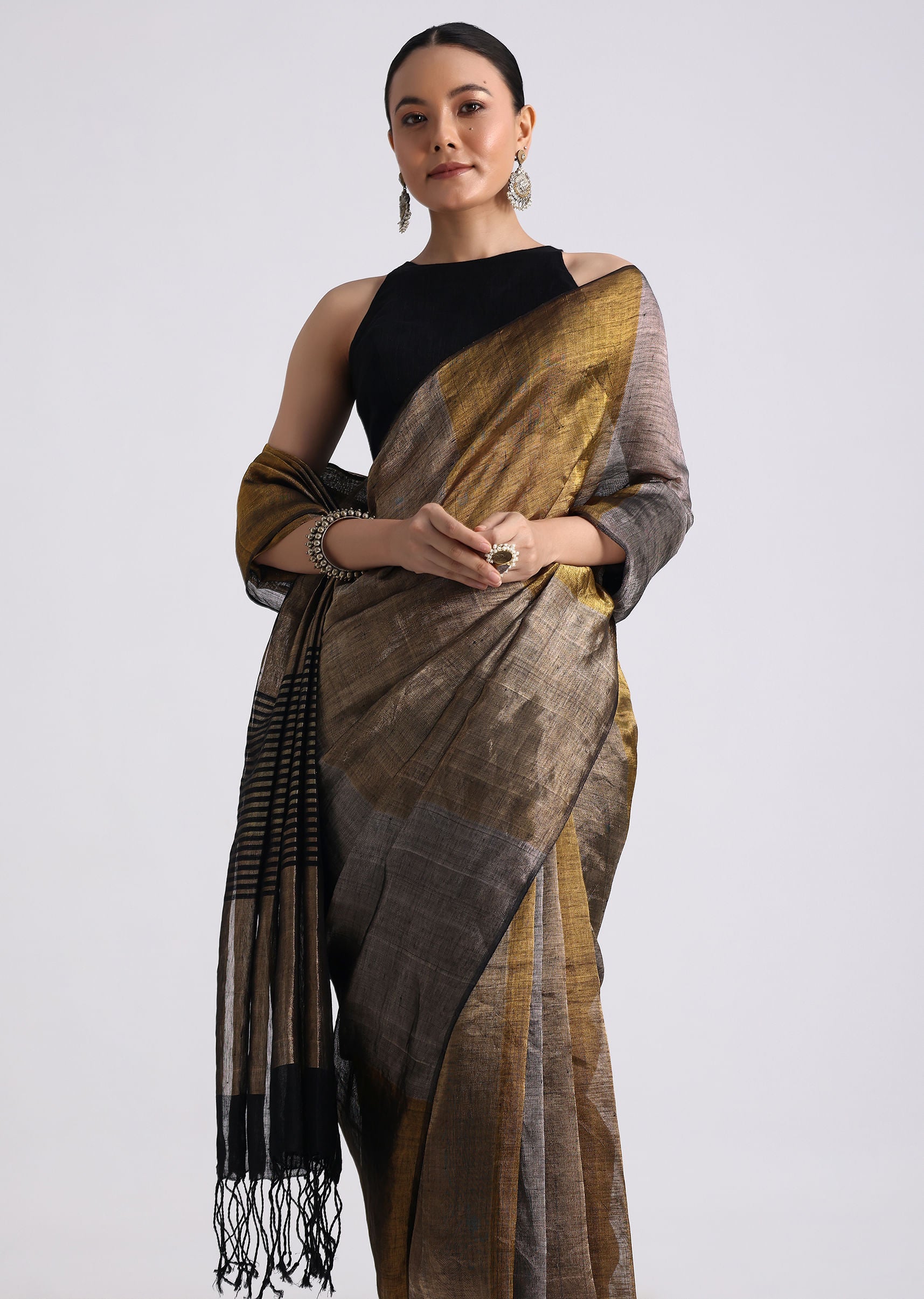 A harmonious blend of traditions and new-age design is this captivating colorblock saree. In hues of black and gold, the woven texture adds to the alluring appeal of this six-yard drape. Crafted from rich tissue linen, the dreamy tassels on the border enhance its look. A stunning choice to showcase you chic style at the next festive gathering. Awarded as the Most Trusted Brand, we're delivering styles you love, just as promised.