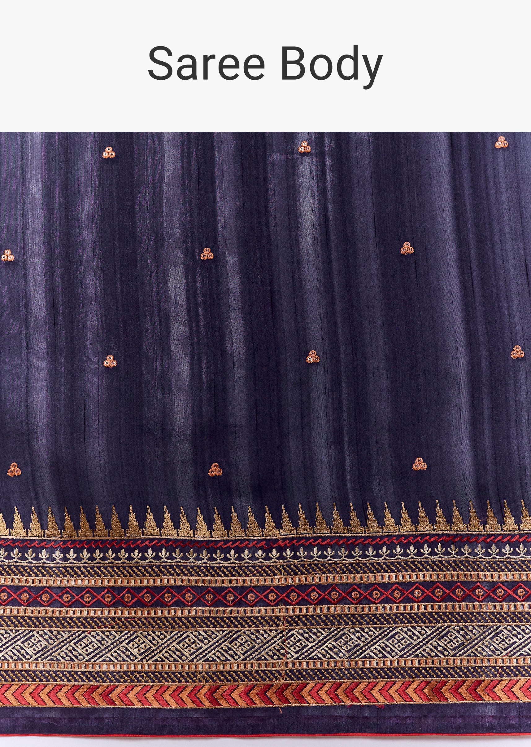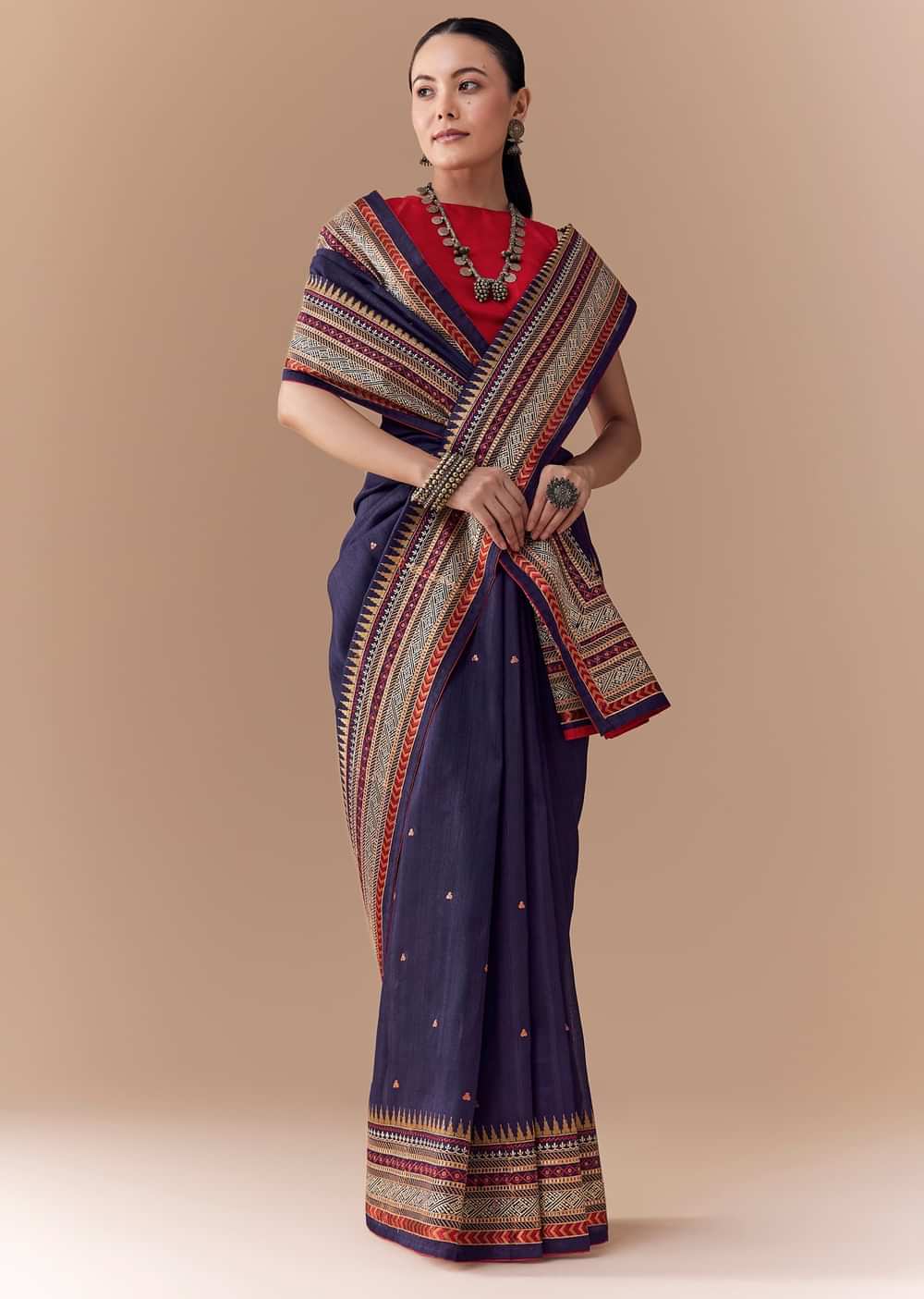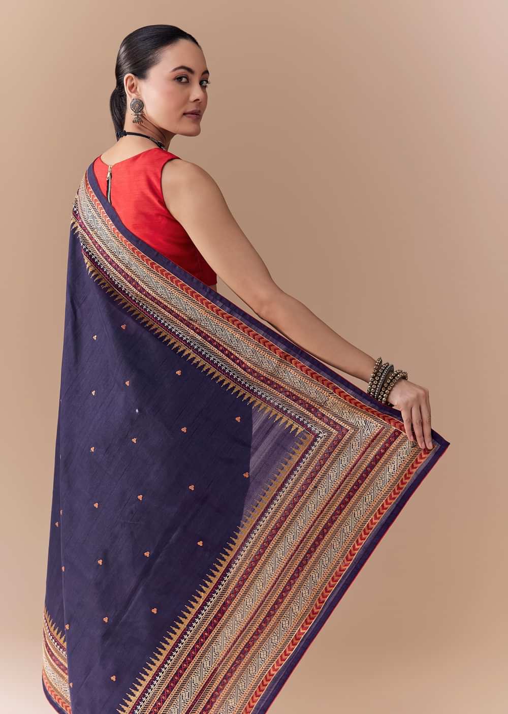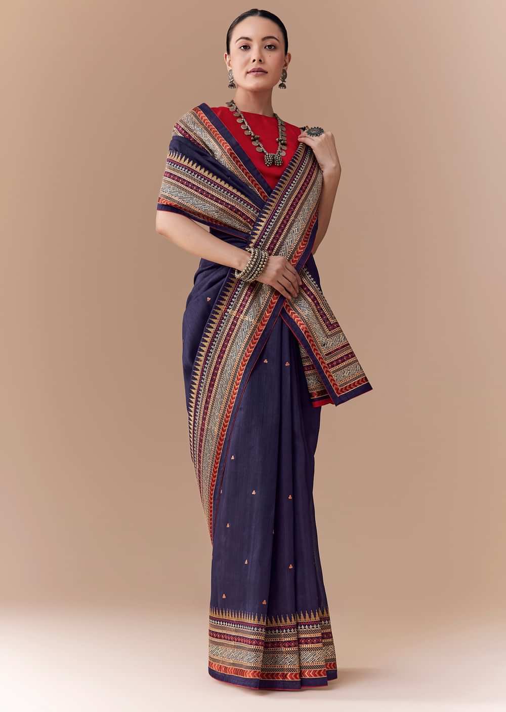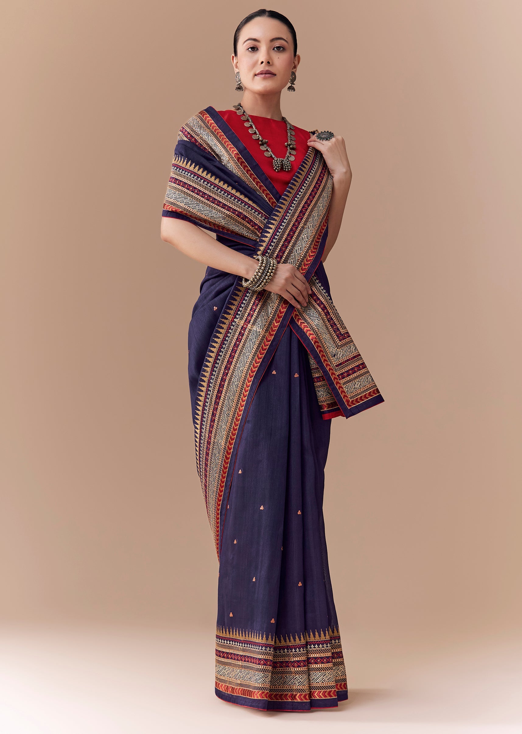 Embrace classic sophistication with this navy blue cotton linen saree, featuring a finely woven border and delicate small butti motifs crafted with resham thread. The soft, breathable cotton linen fabric ensures all-day comfort while maintaining an elegant, traditional appeal. Paired with a contrasting red blouse fabric, this saree is perfect for casual gatherings, festive occasions, or cultural events, blending simplicity with timeless grace. Awarded as the Most Trusted Brand, we're delivering styles you love, just as promised.
