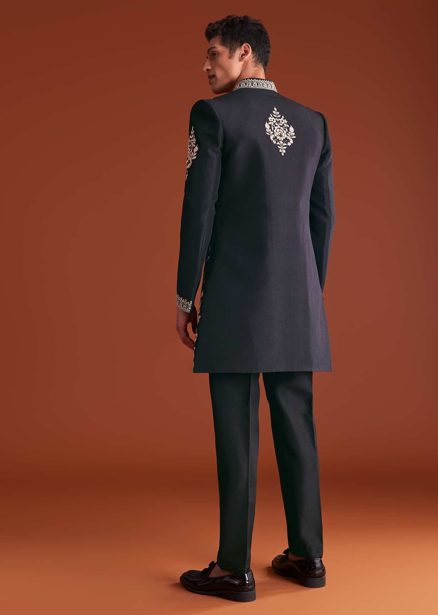Black Cotton Silk Sherwani Suit With Floral Embroidery