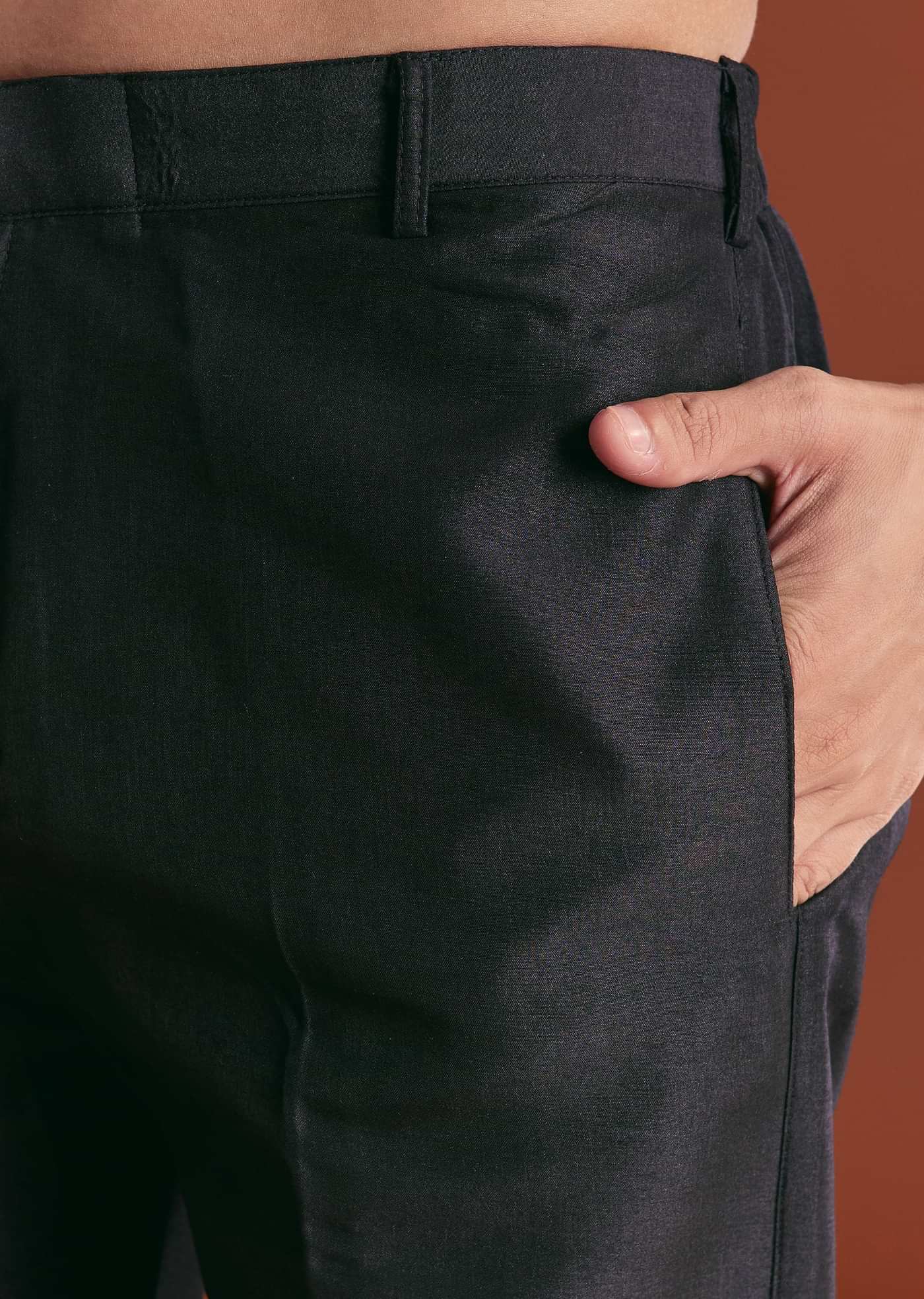 This open-front sherwani in black cotton silk is embroidered with tonal finesse and layered over a matching kurta and bottom, ideal for groomsmen who honour tradition in style. Awarded as... More Product Details