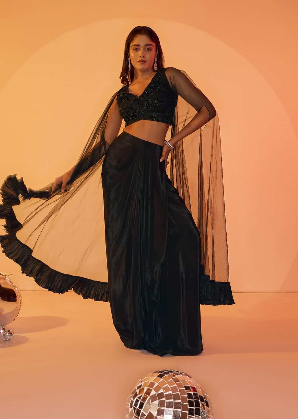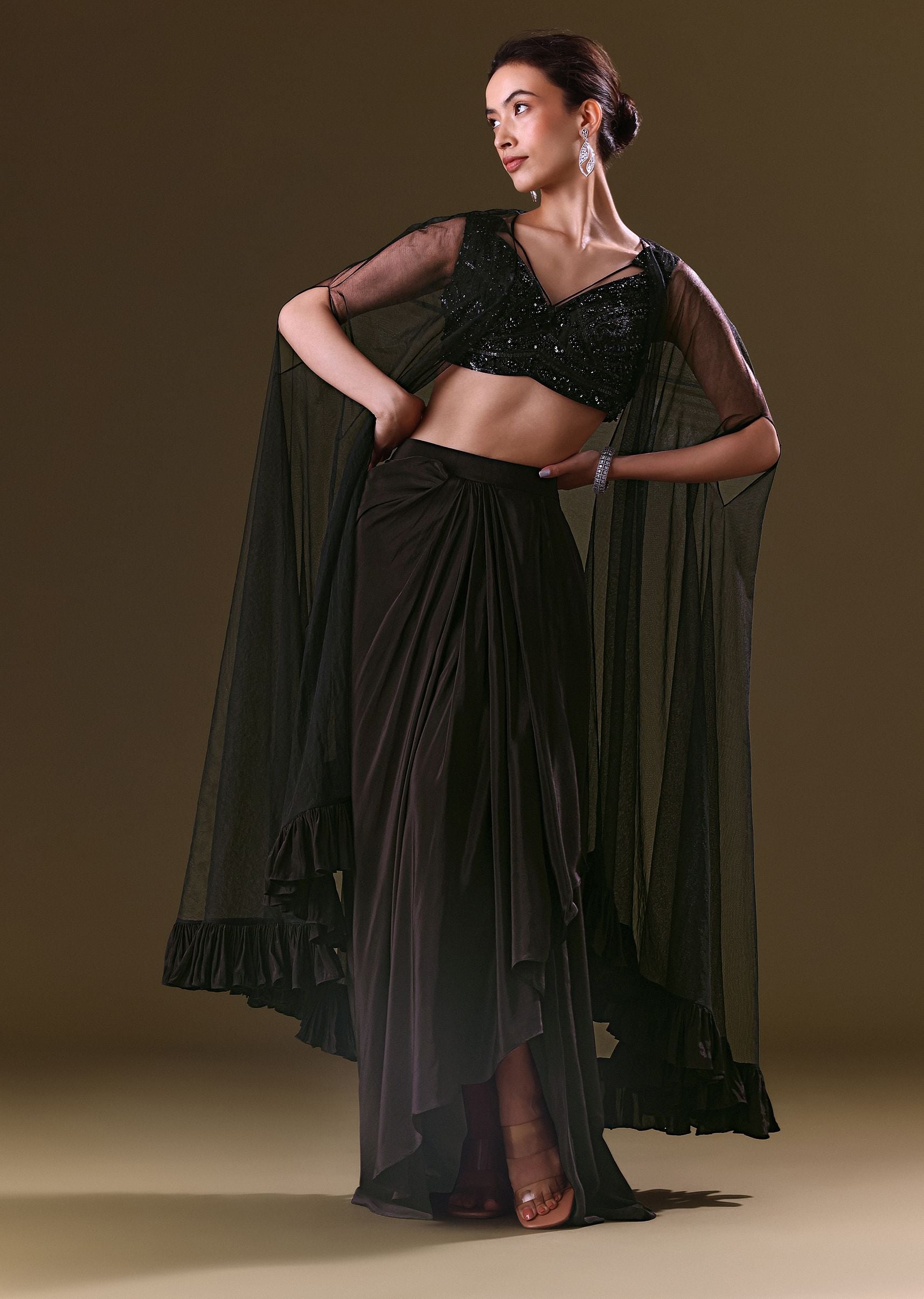 Black Crepe Drape Skirt Choli And Tulle Cape Set