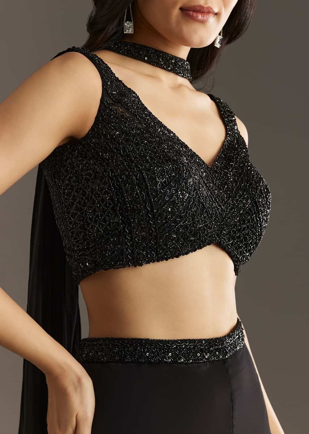 Black Crepe Embroidered Croptop With Embroidered Palazzo And Choker Dupatta