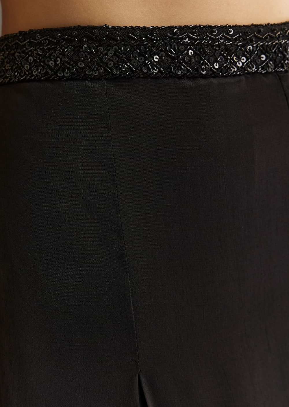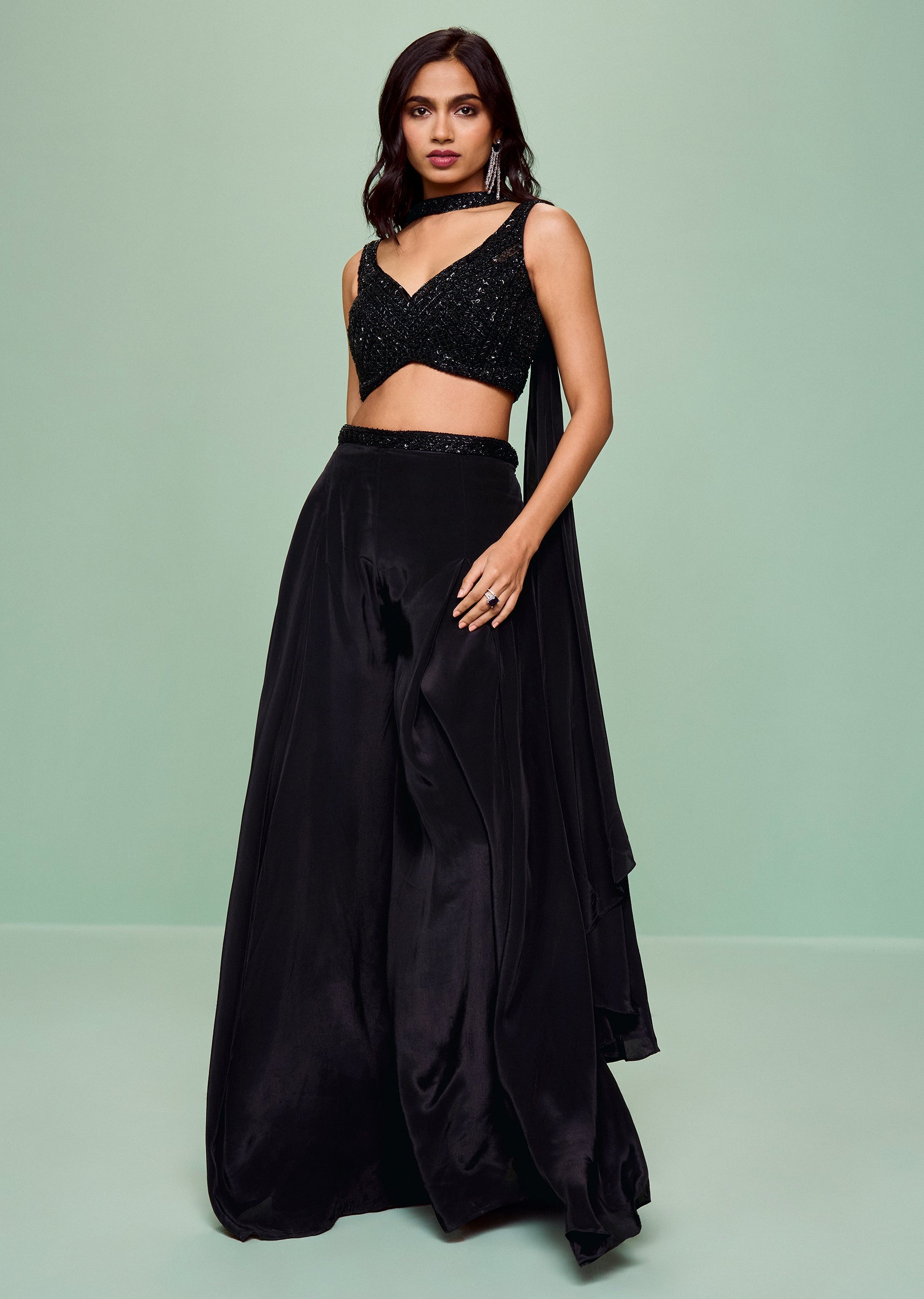 Make a statement in this black crepe crop top set with glitzy cut dana and sequins work. Comes with an embroidered palazzo and structured choker-style dupatta—party ready!Standard length for sharara... More Product Details