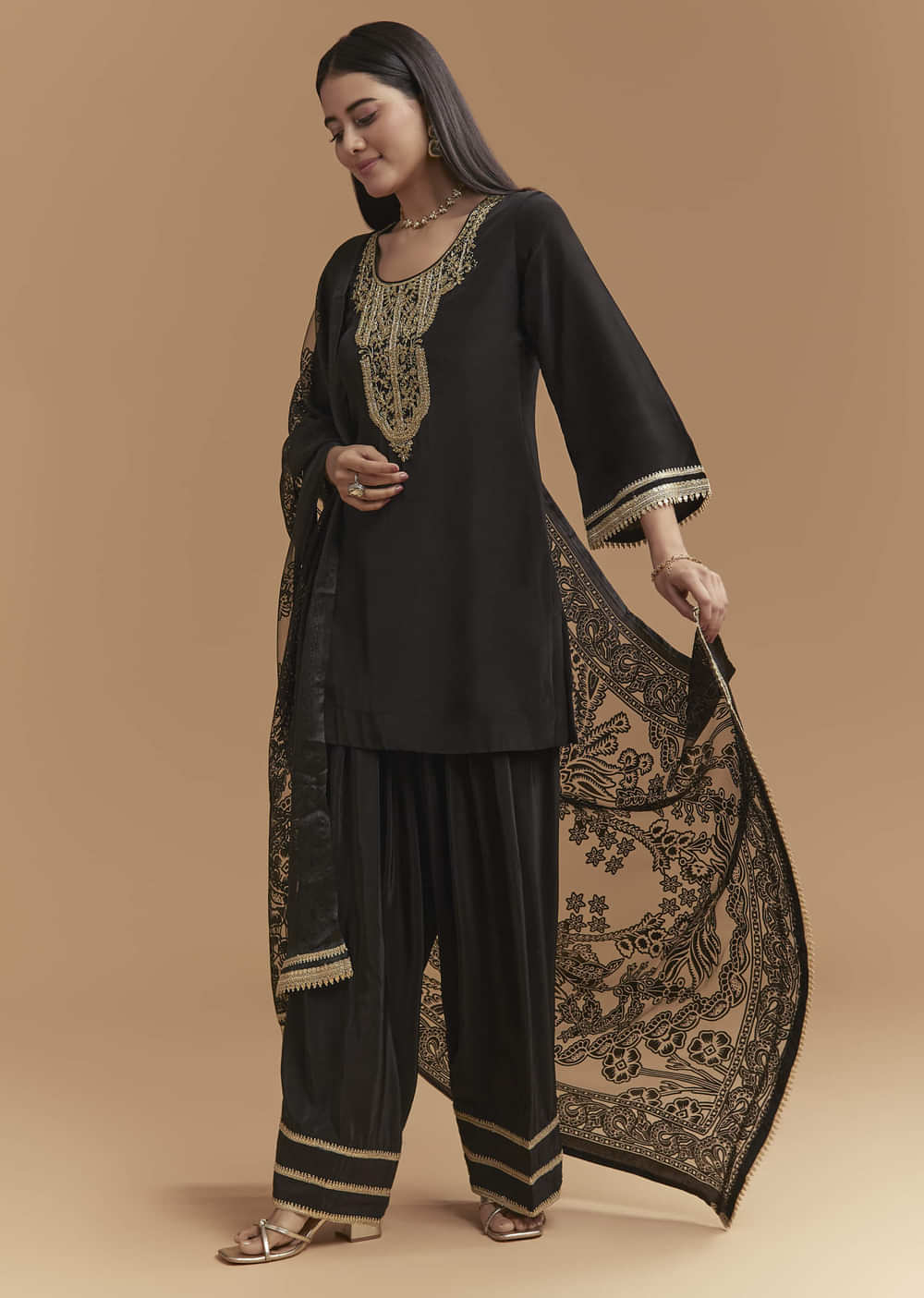 Black Crepe Kurta Set With Zardosi And Gota Work